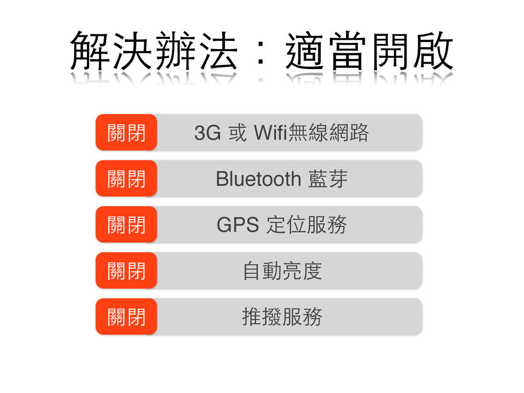 3G 或 Wifi無線網路 Bluetooth 藍芽 GPS 定位服務 ⾃自動亮度 推撥服務 關閉