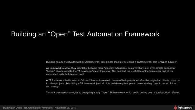 This talk discusses strategies to designing a truly “Open" TA framework which could outlive even a total product refactor.