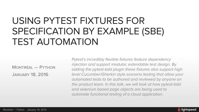 In this talk, we will look at how pytest-bdd and selenium based page objects are being used to automate functional testing of a cloud application.