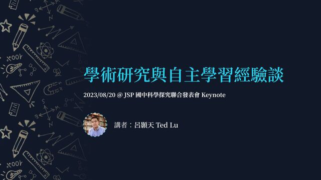 講者:呂顥天 Ted Lu 2023/08/20 @ JSP 國中科學探究聯合發表會 Keynote 學術研究與自主學習經驗談