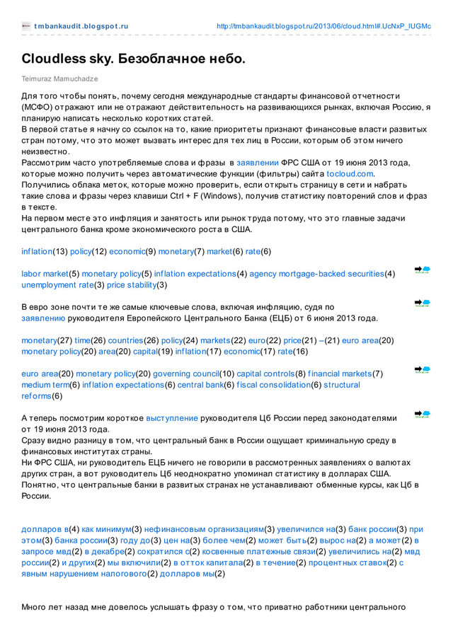 небо. Для того чтобы понять, почему сегодня международные стандарты финансовой отчетности (МСФО) отражают или не отражают действительность на развивающихся рынках, включая Россию, я планирую написать несколько коротких статей. В первой статье я начну со ссылок на то, какие приоритеты признают финансовые власти развитых стран потому, что это может вызвать интерес для тех лиц в России, которым об этом ничего неизвестно. Рассмотрим часто употребляемые слова и фразы в заявлении ФРС США от 19 июня 2013 года, которые можно получить через автоматические функции (фильтры) сайта tocloud.com. Получились облака меток, которые можно проверить, если открыть страницу в сети и набрать такие слова и фразы через клавиши Сtrl + F (Windows), получив статистику повторений слов и фраз в тексте. На первом месте это инфляция и занятость или рынок труда потому, что это главные задачи центрального банка кроме экономического роста в США. inf lation(13) policy(12) economic(9) monetary(7) market(6) rate(6) labor market(5) monetary policy(5) inf lation expectations(4) agency mortgage-backed securities(4) unemployment rate(3) price stability(3) В евро зоне почти те же самые ключевые слова, включая инфляцию, судя по заявлению руководителя Европейского Центрального Банка (ЕЦБ) от 6 июня 2013 года. monetary(27) time(26) countries(26) policy(24) markets(22) euro(22) price(21) –(21) euro area(20) monetary policy(20) area(20) capital(19) inf lation(17) economic(17) rate(16) euro area(20) monetary policy(20) governing council(10) capital controls(8) f inancial markets(7) medium term(6) inf lation expectations(6) central bank(6) f iscal consolidation(6) structural ref orms(6) А теперь посмотрим короткое выступление руководителя Цб России перед законодателями от 19 июня 2013 года. Сразу видно разницу в том, что центральный банк в России ощущает криминальную среду в финансовых институтах страны. Ни ФРС США, ни руководитель ЕЦБ ничего не говорили в рассмотренных заявлениях о валютах других стран, а вот руководитель Цб неоднократно упоминал статистику в долларах США. Понятно, что центральные банки в развитых странах не устанавливают обменные курсы, как Цб в России. долларов в(4) как минимум(3) нефинансовым организациям(3) увеличился на(3) банк россии(3) при этом(3) банка россии(3) году до(3) цен на(3) более чем(2) может быть(2) вырос на(2) а может(2) в запросе мвд(2) в декабре(2) сократился с(2) косвенные платежные связи(2) увеличились на(2) мвд россии(2) и других(2) мы включили(2) в отток капитала(2) в течение(2) процентных ставок(2) с явным нарушением налогового(2) долларов мы(2) Много лет назад мне довелось услышать фразу о том, что приватно работники центрального