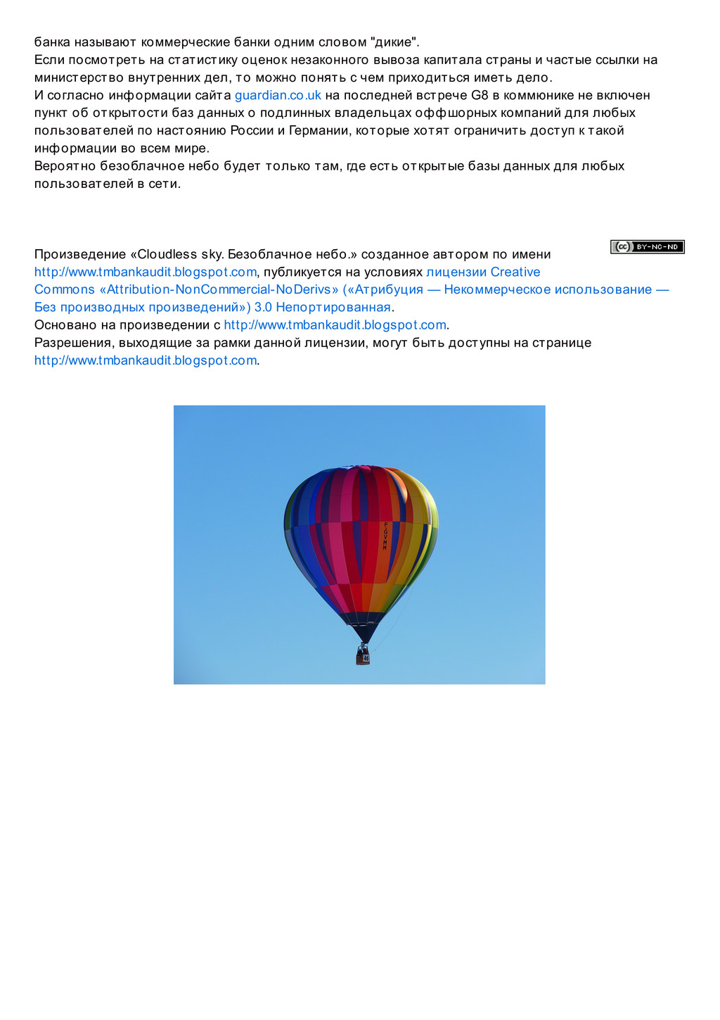 статистику оценок незаконного вывоза капитала страны и частые ссылки на министерство внутренних дел, то можно понять с чем приходиться иметь дело. И согласно информации сайта guardian.co.uk на последней встрече G8 в коммюнике не включен пункт об открытости баз данных о подлинных владельцах оффшорных компаний для любых пользователей по настоянию России и Германии, которые хотят ограничить доступ к такой информации во всем мире. Вероятно безоблачное небо будет только там, где есть открытые базы данных для любых пользователей в сети. Произведение «Cloudless sky. Безоблачное небо.» созданное автором по имени http://www.tmbankaudit.blogspot.com, публикуется на условиях лицензии Creative Commons «Attribution-NonCommercial-NoDerivs» («Атрибуция — Некоммерческое использование — Без производных произведений») 3.0 Непортированная. Основано на произведении с http://www.tmbankaudit.blogspot.com. Разрешения, выходящие за рамки данной лицензии, могут быть доступны на странице http://www.tmbankaudit.blogspot.com.