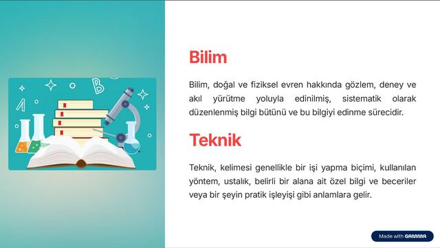 ak1l yürütme yoluyla edinilmi_, sistematik olarak düzenlenmi_ bilgi bütünü ve bu bilgiyi edinme sürecidir. Teknik Teknik, kelimesi genellikle bir i_i yapma biçimi, kullan1lan yöntem, ustal1k, belirli bir alana ait özel bilgi ve beceriler veya bir _eyin pratik i_leyi_i gibi anlamlara gelir.