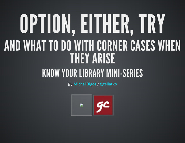Know your library mini-series. How to use Scala library classes: Option, Either and Try. Functional exception handling, i.e. what to do with corner cases when they arise.