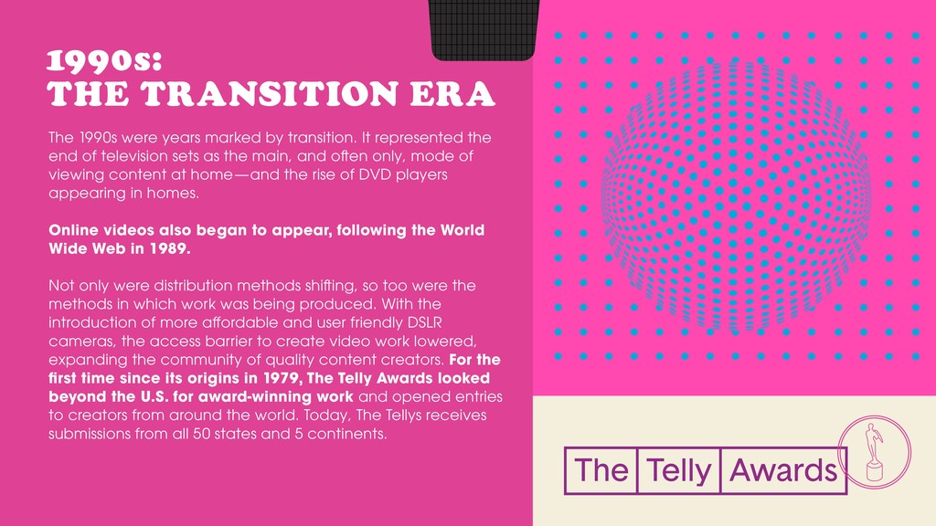 The 2019 Telly Report is a time capsule, examining the state of video over 40 years. From the rise of cable to the introduction of the Internet, we’re celebrating how technological revolutions have shifted video and television—and the evolution of The Telly Awards’ role in honoring the best of it.