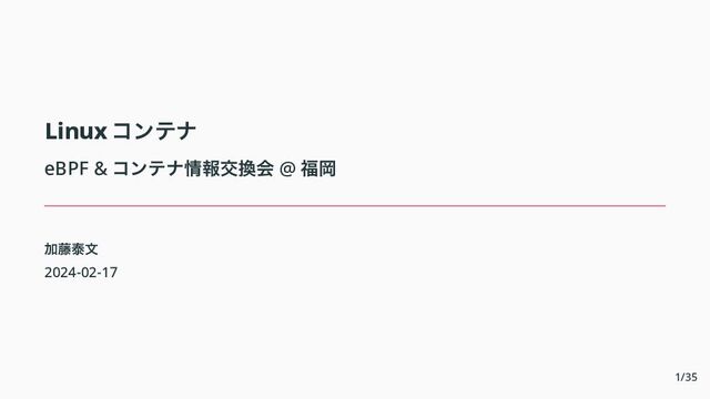 「eBPF & コンテナ情報交換会 @ 福岡」の発表資料です。 参考となる情報にはPDF中からリンクをしていますが、資料中のリンクは Speaker Deck 上ではクリックできないので PDF をダウンロードしてご覧ください。 デモの動画は https://asciinema.org/a/BbYcyk5vaFXk5RbOXWStDvj2Y です。