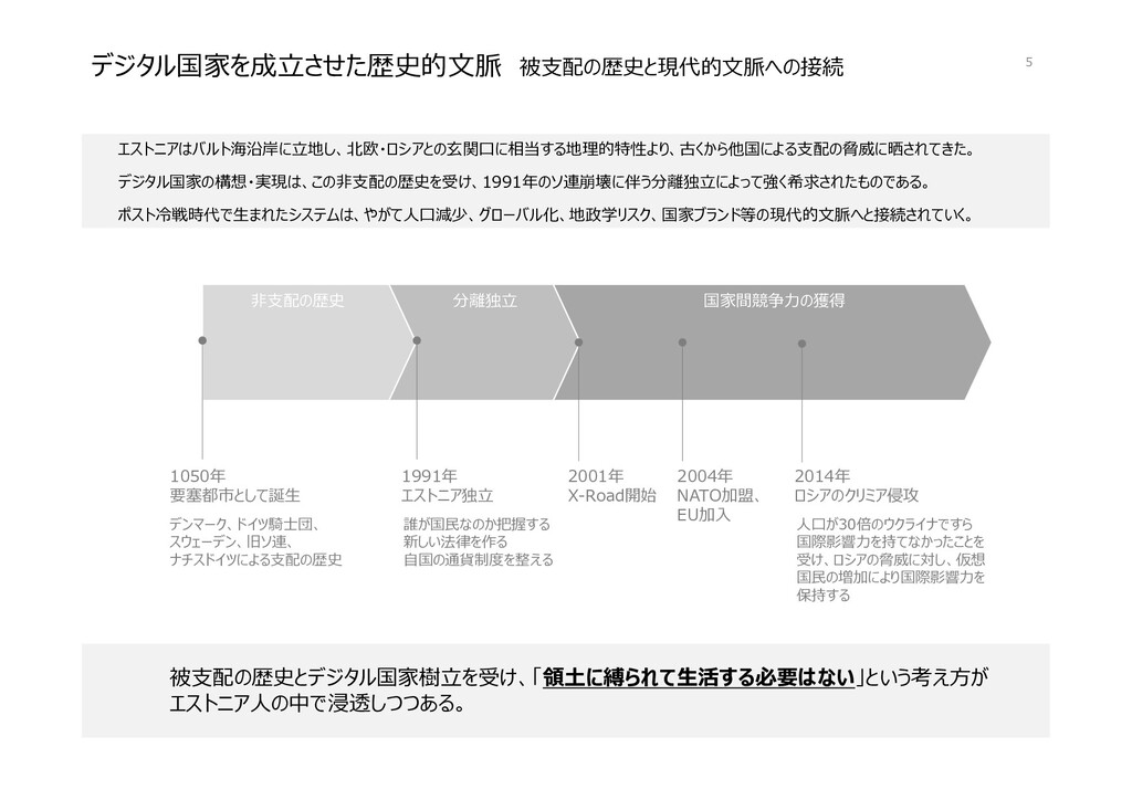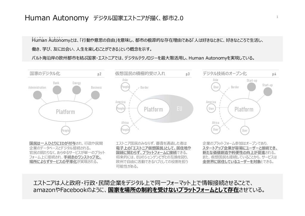 2010 2015 2020 2025 2030 2035 2040 157万人 120万人 (予想) ・・・ 図 エストニアの人口推移 エストニアは人口減少の時代を迎えており、2040年 には1990年比で23.6%減少する見込みである。 人口減少により、国全体の購買力が低下し、世界 から見た市場としての存在感を失う。 外資系企業の撤退、海外投資減少を招き、国内 企業は売上規模や雇用を維持することができず、 若者が国外へ離脱するなど、国家基盤を維持でき ない恐れが生じる。 エストニアの人口減少問題 デジタル上の仮想国民 仮想国民制度によるメリット 国外 エストニア国内 X-Road 移民 外国人 労働者 ・治安の悪化 ・経済格差の顕在・固定化 インフラ、福祉基盤の維持 政策 懸念 ・技術移転問題 ・保険、送金、税務事務の課題 ・不法滞在対策 人口減少に対し、移民または外国人労働者政策が 模索されているものの、受け入れ側の懸念がある。 懸念の多くは、外国人の国内定住が起因の心理・ 社会・実務的事項である。 エストニアでは、デジタル政府の利点を活かし、一定 の審査要件を満たした外国人に対し、国外に居住 しながら、エストニアのデジタルサービスを利用でき る仮想国民(イーレジデンシー)制度を創設した。 仮想国民のメリット オンラインで 法人設立が 可能 居住せず電子 サービスの 利用が可能 電子署名での 契約が可能 (雇用・賃貸) エストニアのメリット 海外投資の 増加 人口増による 国内サービス 市場の活性化 治安対策、 収税、行政 手続き簡略化 現在、151ヵ国・4万人の申請者が集まり、3,500 社以上の起業に繋がっている。 日本からはすでに1,600人以上が仮想国民を取得。 (安倍晋三首相も登録している) あらゆる経済・社会活動がオンライン化され、 居住地・働き方を問わないライフスタイルを獲得 追加投資や治安悪化の懸念なく、人口と投資の 増加を享受できる