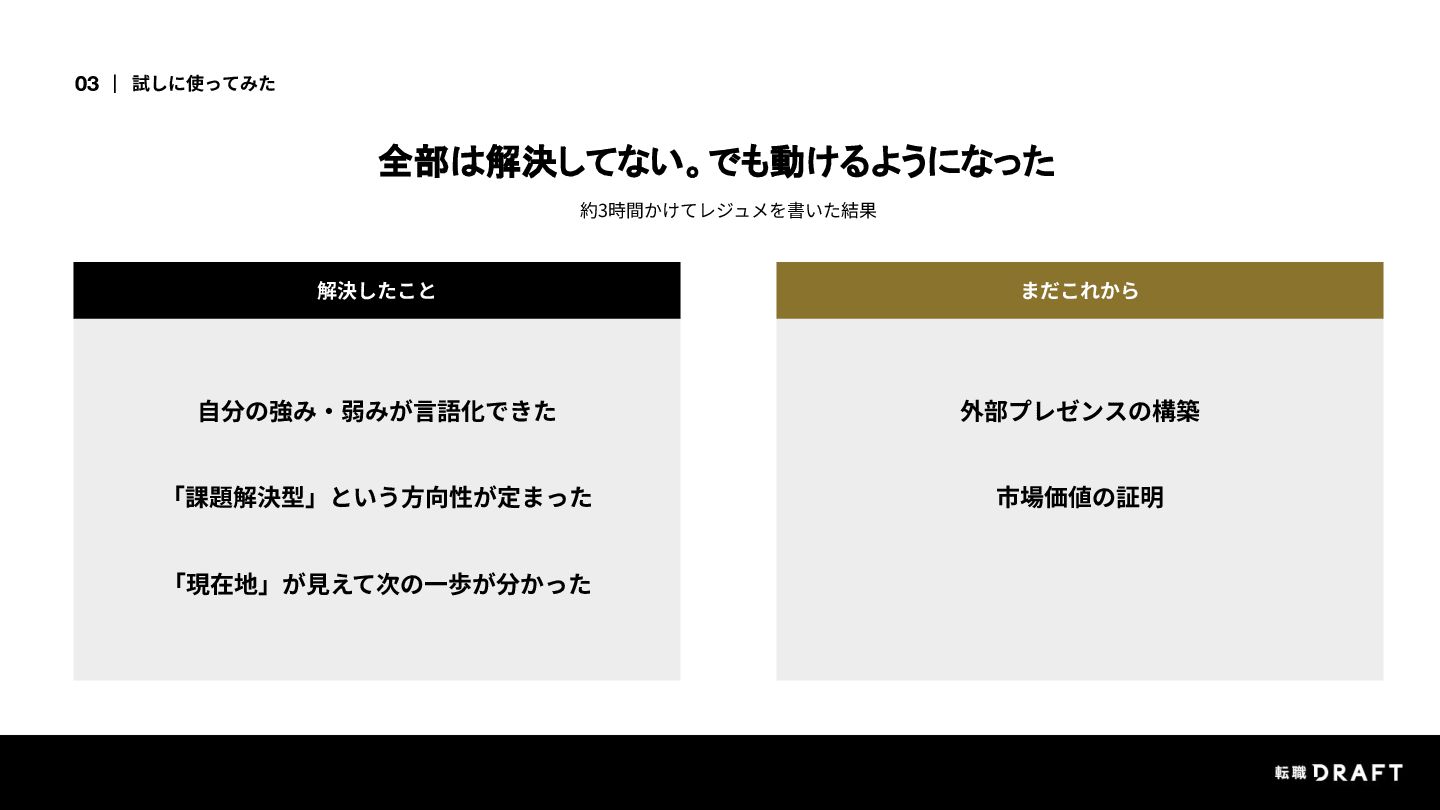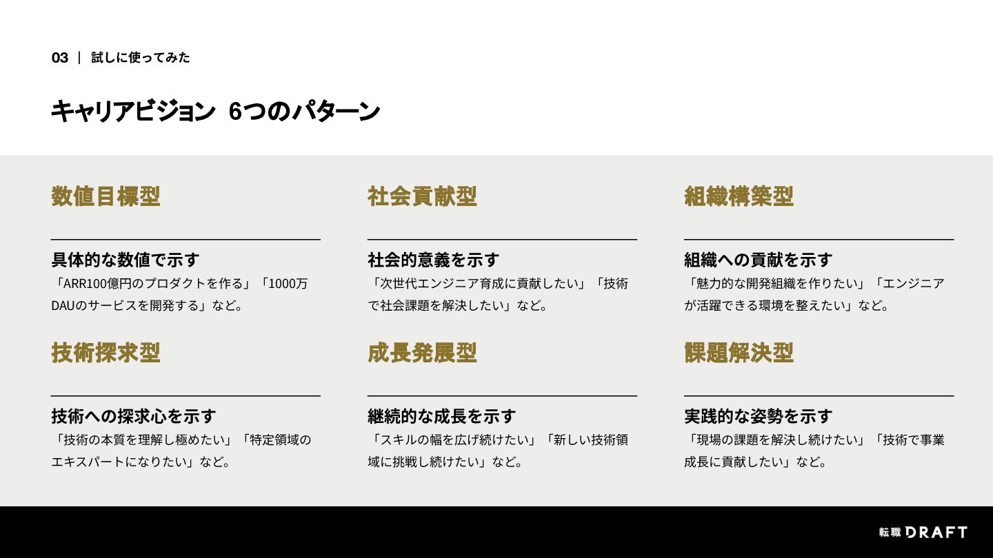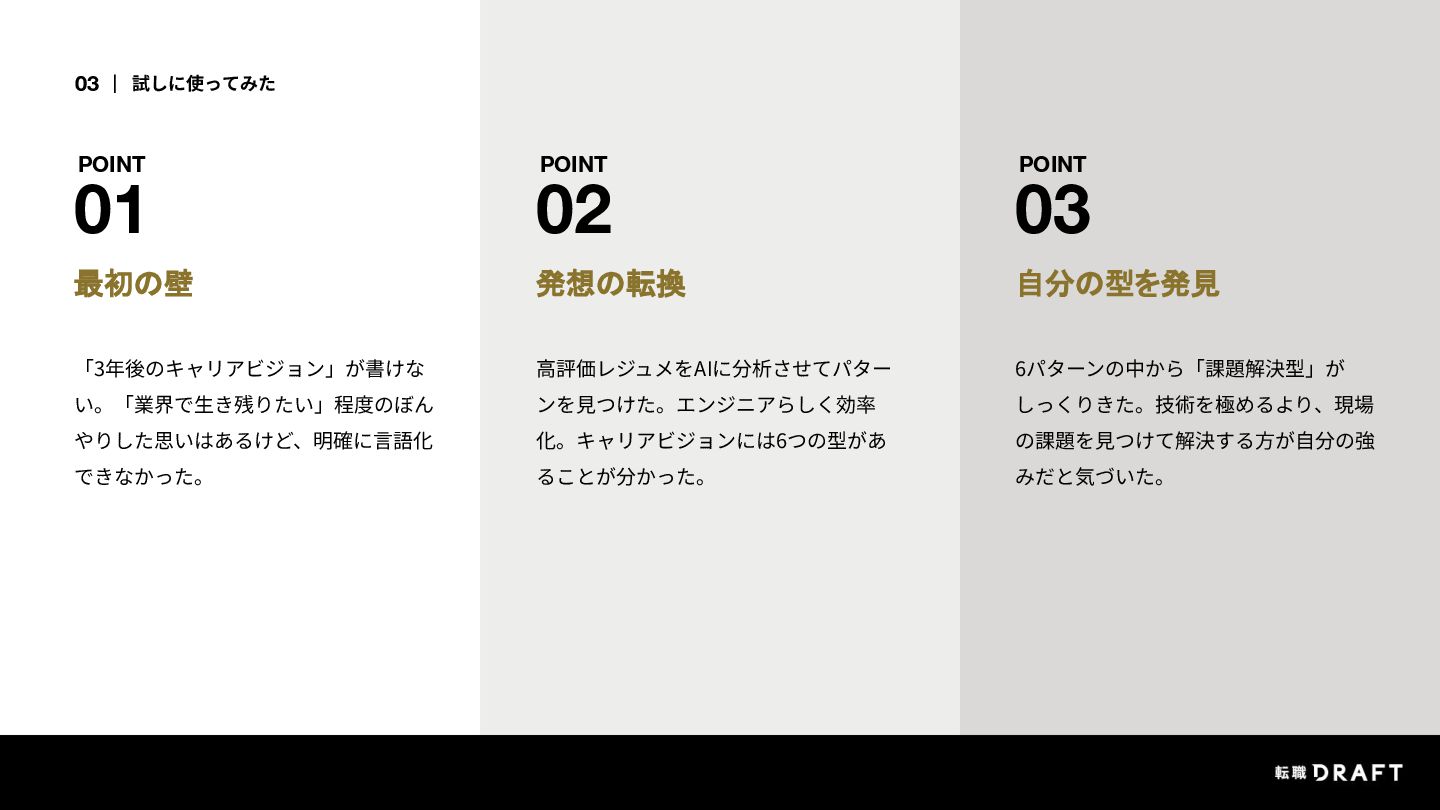 試しに自社サービスでレジュメを書いてみたら、「キャリアビジョン」が全然書けない。そこでAIに高評価レジュメを分析させたところ、ビジョンには6つの型があることを発見。自分の型が分かったら、少しだけ前に進めました。