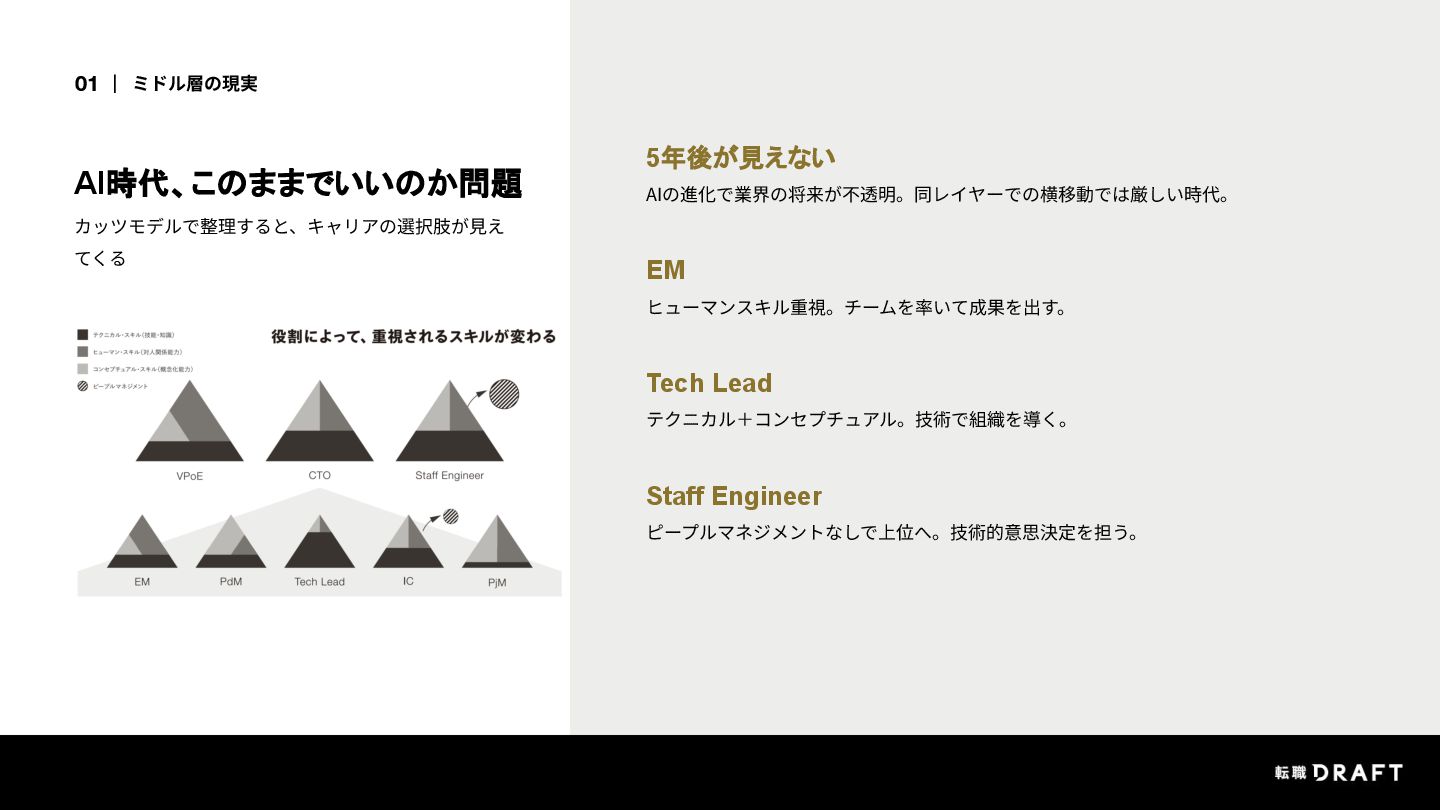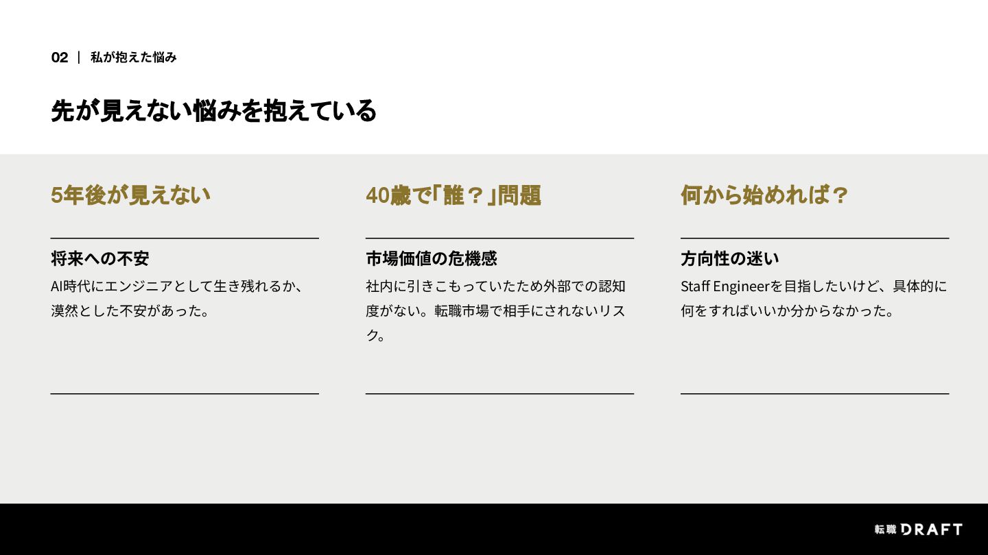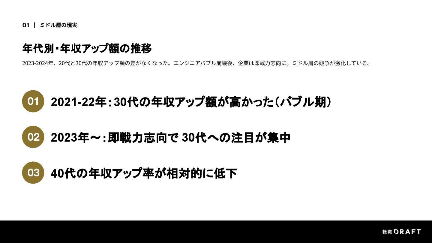 転職ドラフトのデータを見ると、ミドル層を取り巻く環境は年々厳しくなっています。でも、不安の正体が分からないから動けない。そんな状態が続いていました。