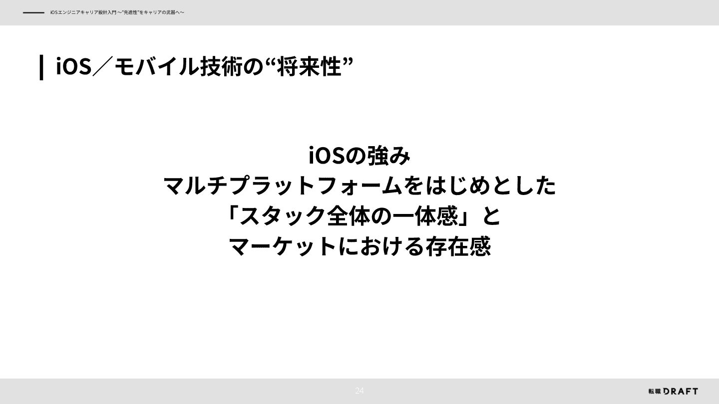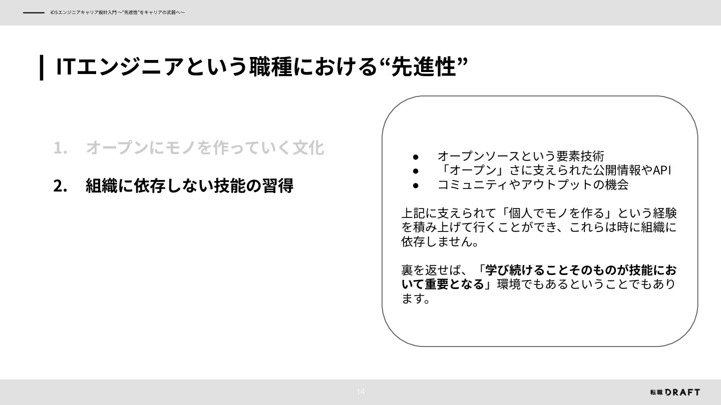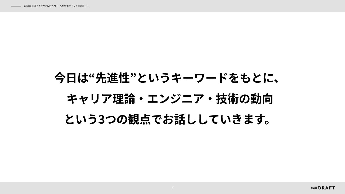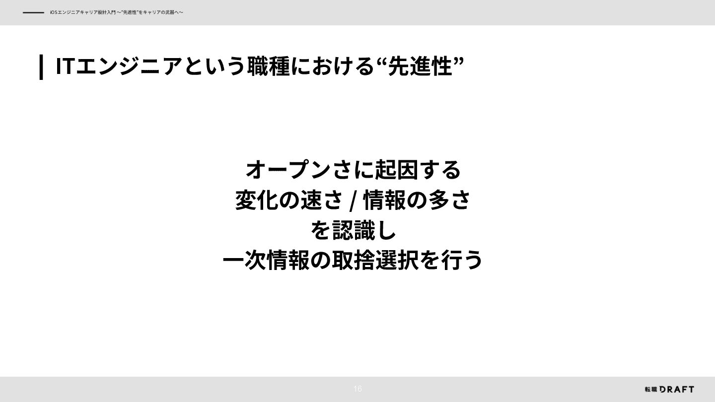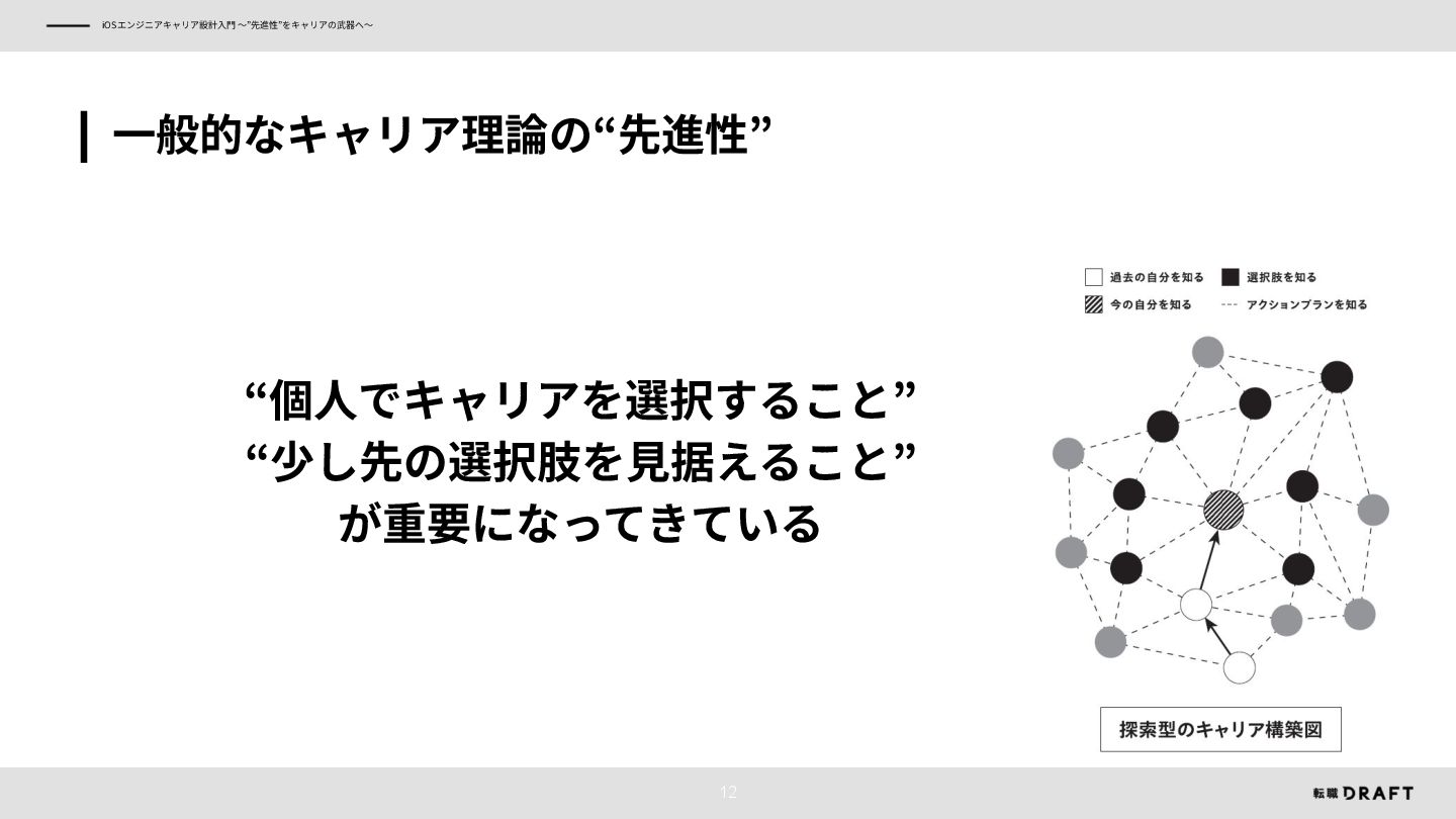 そのヒントは、iOS技術やエンジニアのキャリアにおける"先進性"と、転職ドラフトが提唱するマインドセット「探索型キャリア」の融合にあります。