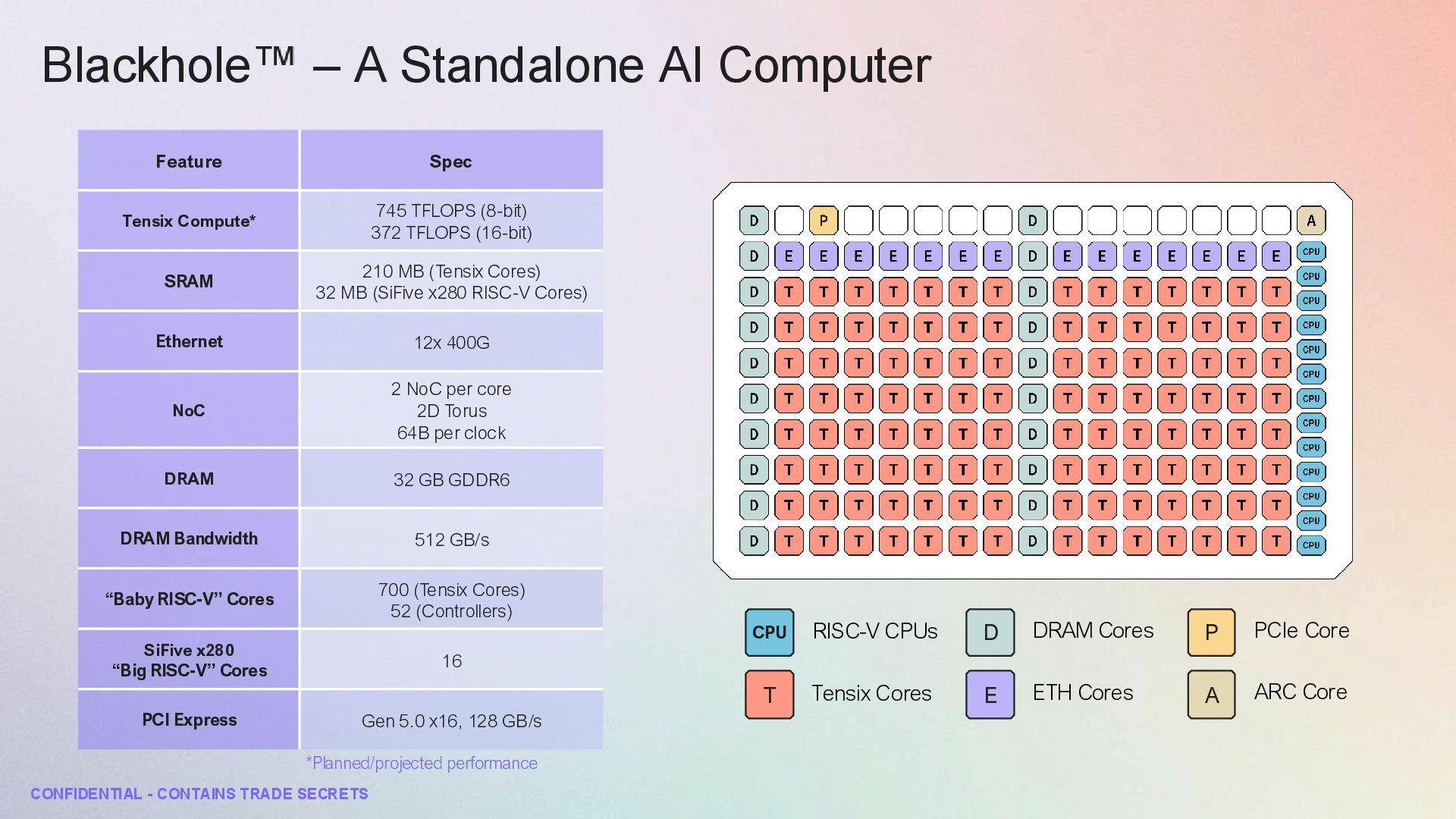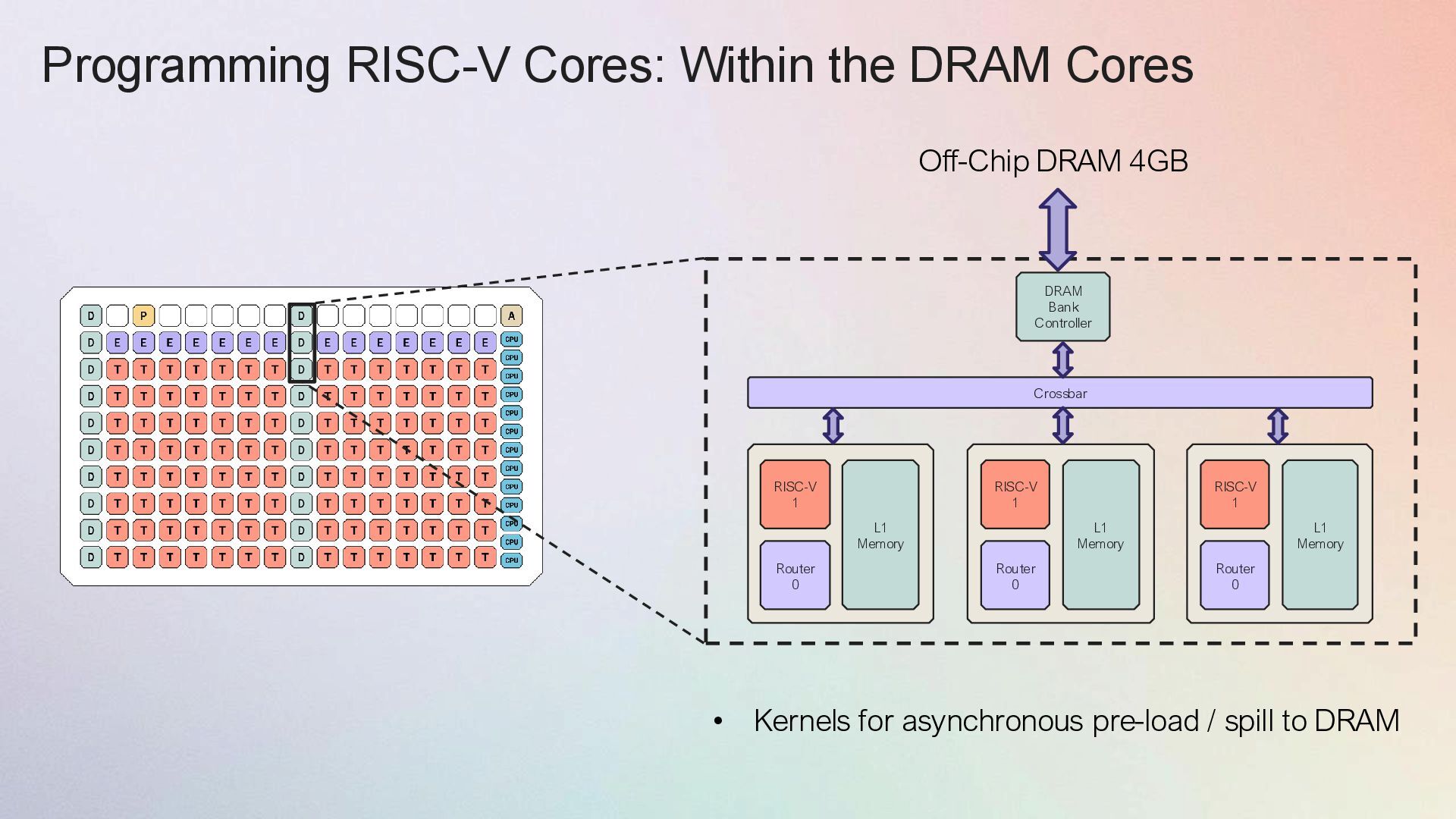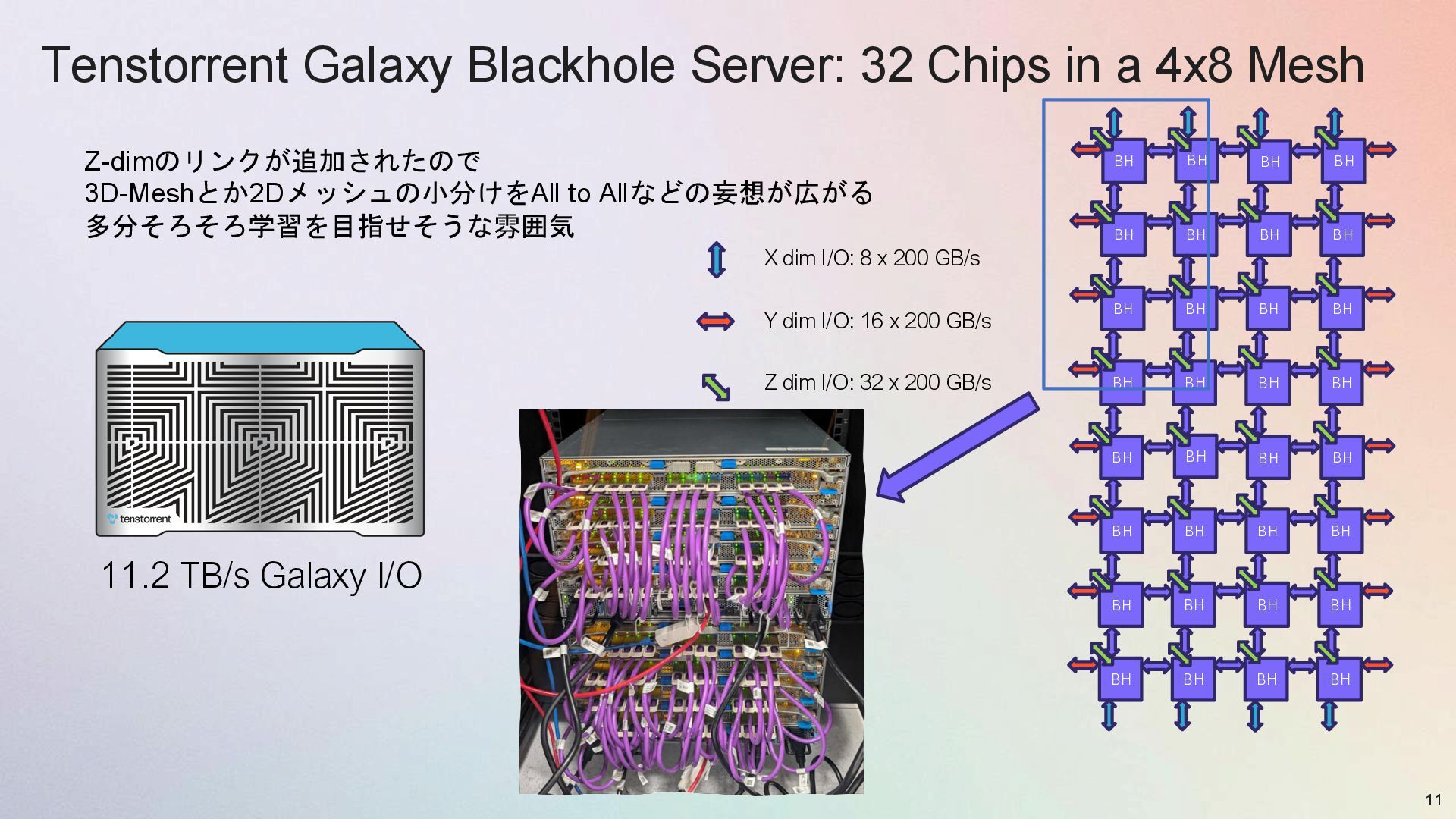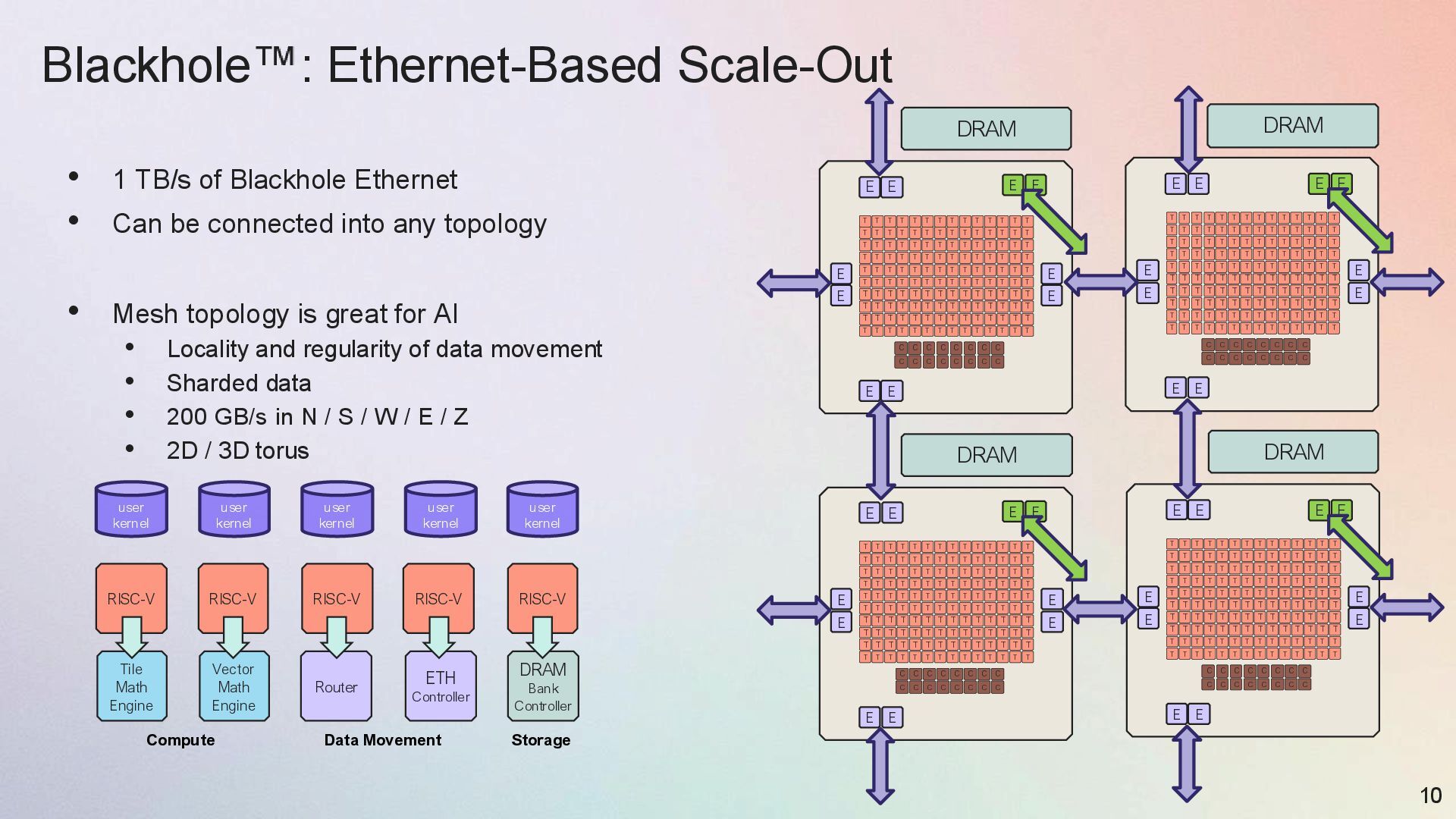 • Can be connected into any topology • Mesh topology is great for AI • Locality and regularity of data movement • Sharded data • 200 GB/s in N / S / W / E / Z • 2D / 3D torus 10 T T T T T T T T T T T T T T T T T T T T T T T T T T T T T T T T T T T T T T T T T T T T T T T T T T T T T T T T T T T T T T T T T T T T T T T T T T T T T T T T T T T T T T T T T T T T T T T T T T T T T T T T T T T T T T T T T T T T T T T T T T T T T T T T T T T T T T T T T T T T C C C C C C C C C C C C C C C C E E E E E E E E DRAM T T T T T T T T T T T T T T T T T T T T T T T T T T T T T T T T T T T T T T T T T T T T T T T T T T T T T T T T T T T T T T T T T T T T T T T T T T T T T T T T T T T T T T T T T T T T T T T T T T T T T T T T T T T T T T T T T T T T T T T T T T T T T T T T T T T T T T T T T T T T C C C C C C C C C C C C C C C C E E E E E E E E DRAM T T T T T T T T T T T T T T T T T T T T T T T T T T T T T T T T T T T T T T T T T T T T T T T T T T T T T T T T T T T T T T T T T T T T T T T T T T T T T T T T T T T T T T T T T T T T T T T T T T T T T T T T T T T T T T T T T T T T T T T T T T T T T T T T T T T T T T T T T T T T C C C C C C C C C C C C C C C C E E E E E E E E DRAM T T T T T T T T T T T T T T T T T T T T T T T T T T T T T T T T T T T T T T T T T T T T T T T T T T T T T T T T T T T T T T T T T T T T T T T T T T T T T T T T T T T T T T T T T T T T T T T T T T T T T T T T T T T T T T T T T T T T T T T T T T T T T T T T T T T T T T T T T T T T C C C C C C C C C C C C C C C C E E E E E E E E DRAM E E E E E E E E Tile Math Engine RISC-V Router DRAM Bank Controller ETH Controller Vector Math Engine Compute Data Movement Storage RISC-V RISC-V RISC-V RISC-V user kernel user kernel user kernel user kernel user kernel