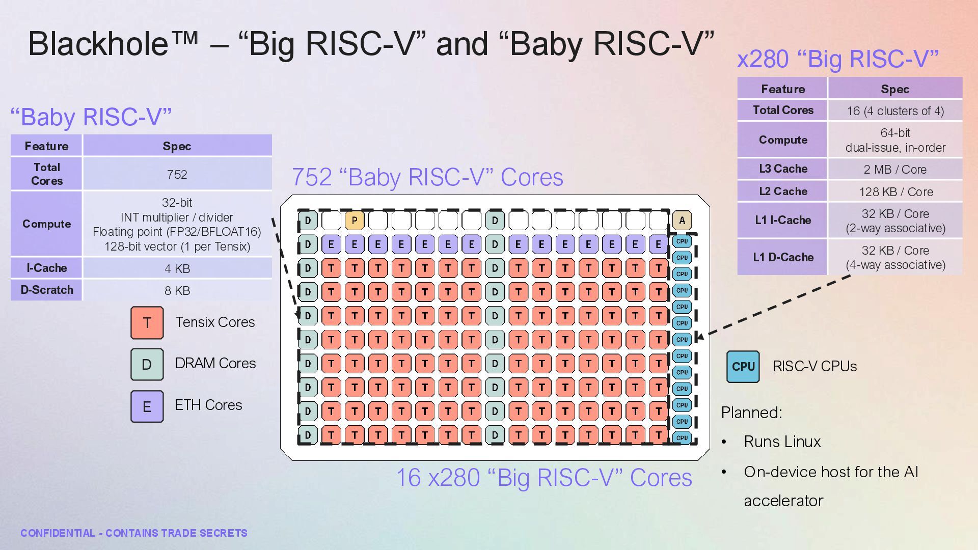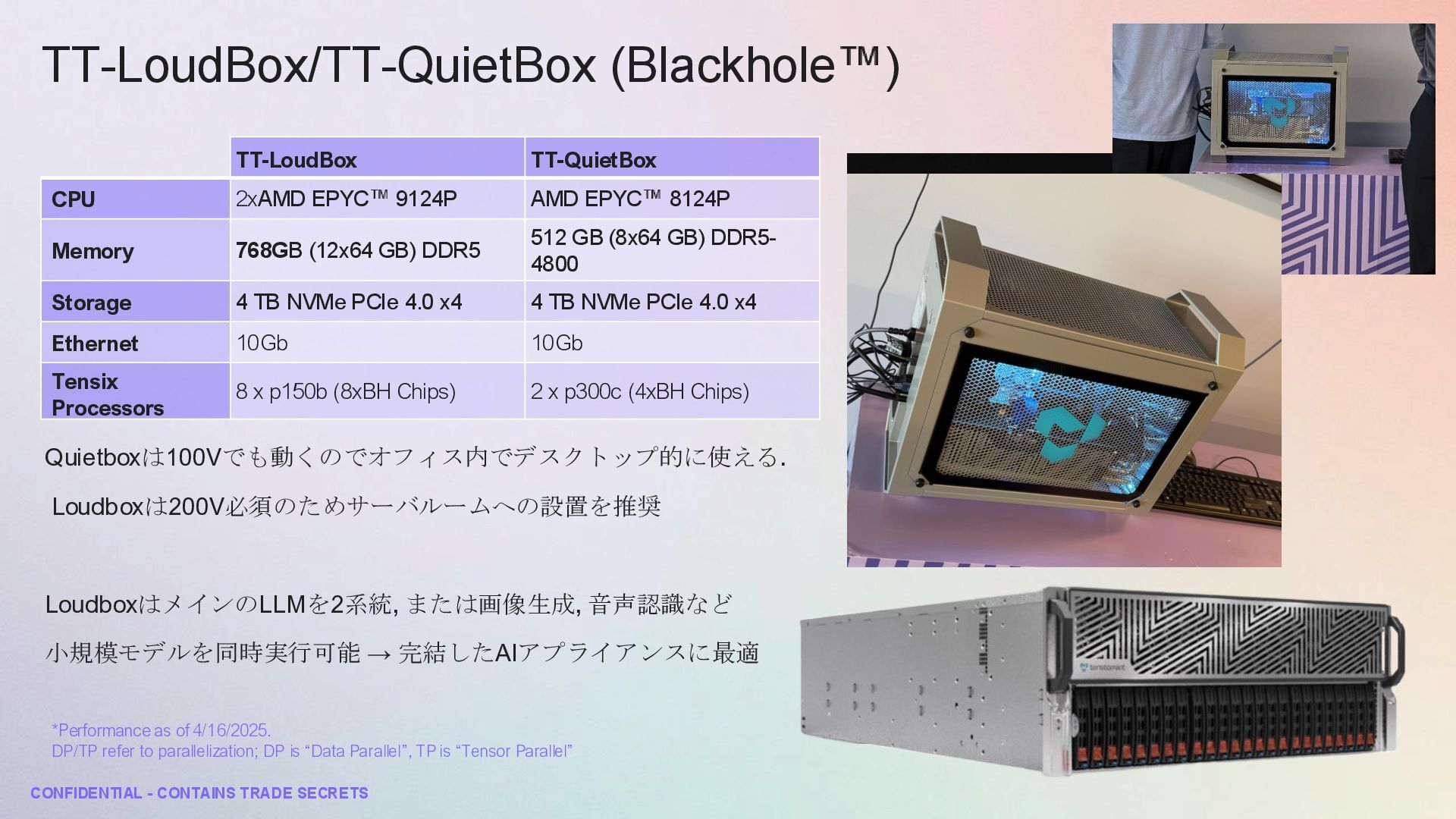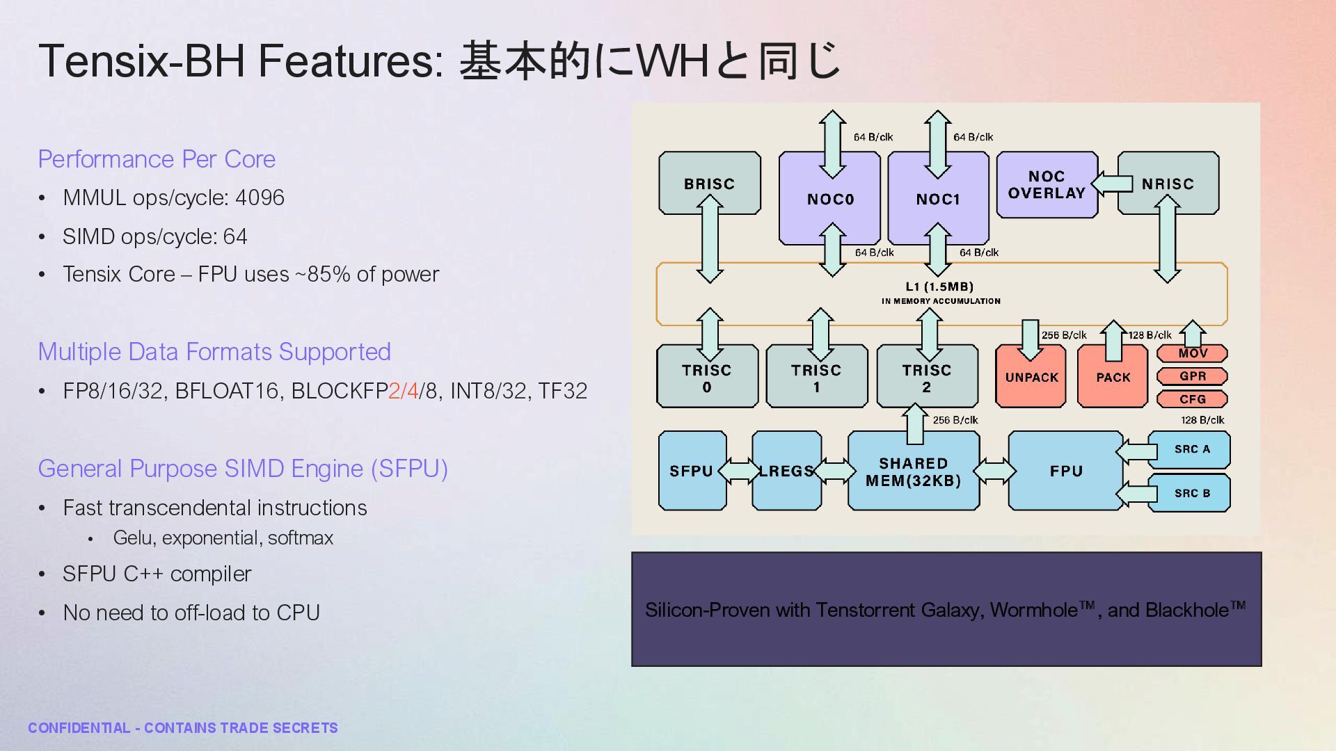 64 • Tensix Core – FPU uses ~85% of power Multiple Data Formats Supported • FP8/16/32, BFLOAT16, BLOCKFP2/4/8, INT8/32, TF32 General Purpose SIMD Engine (SFPU) • Fast transcendental instructions • Gelu, exponential, softmax • SFPU C++ compiler • No need to off-load to CPU CONFIDENTIAL - CONTAINS TRADE SECRETS Tensix-BH Features: 基本的にWHと同じ Silicon-Proven with Tenstorrent Galaxy, Wormhole , and Blackhole