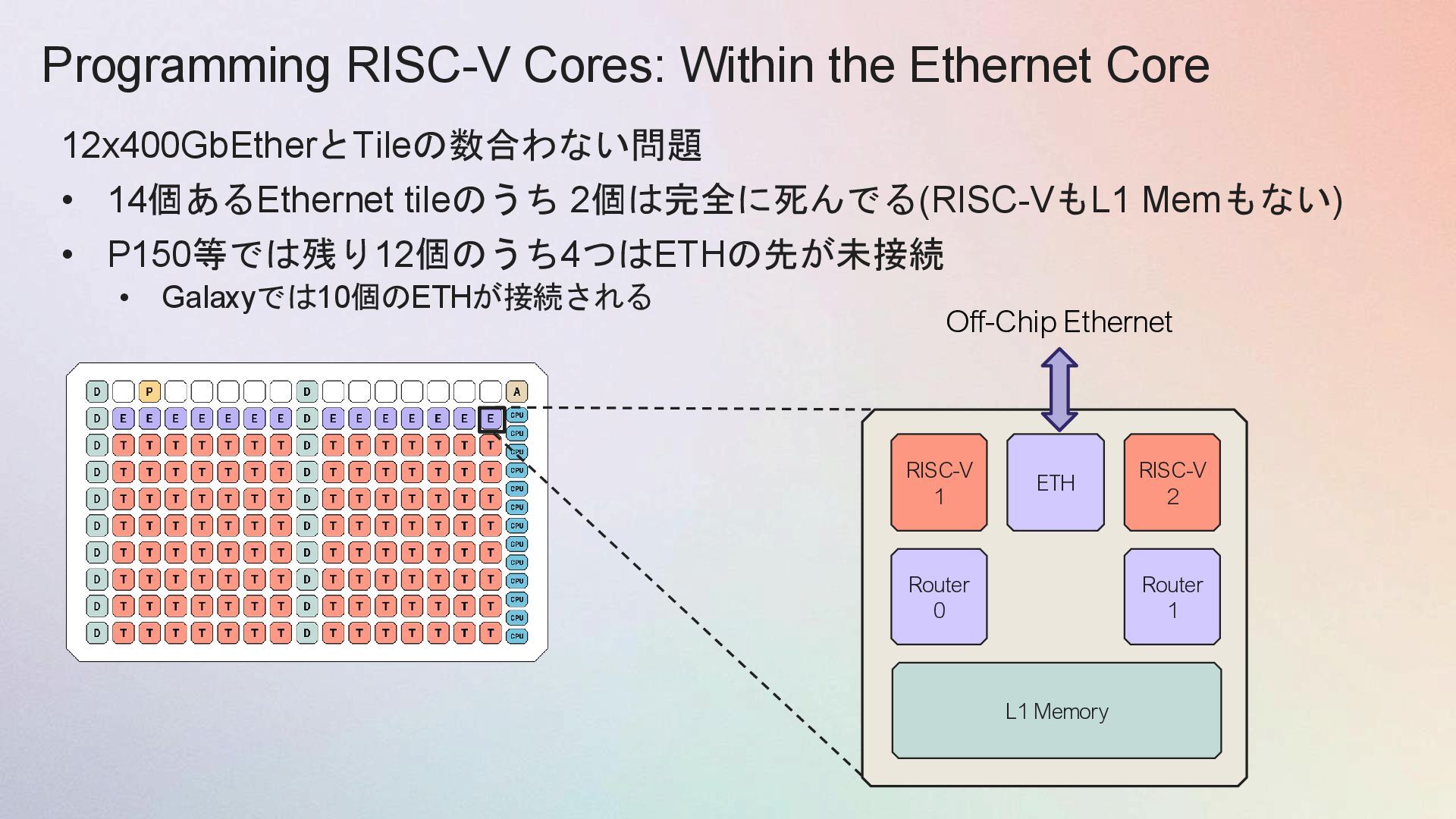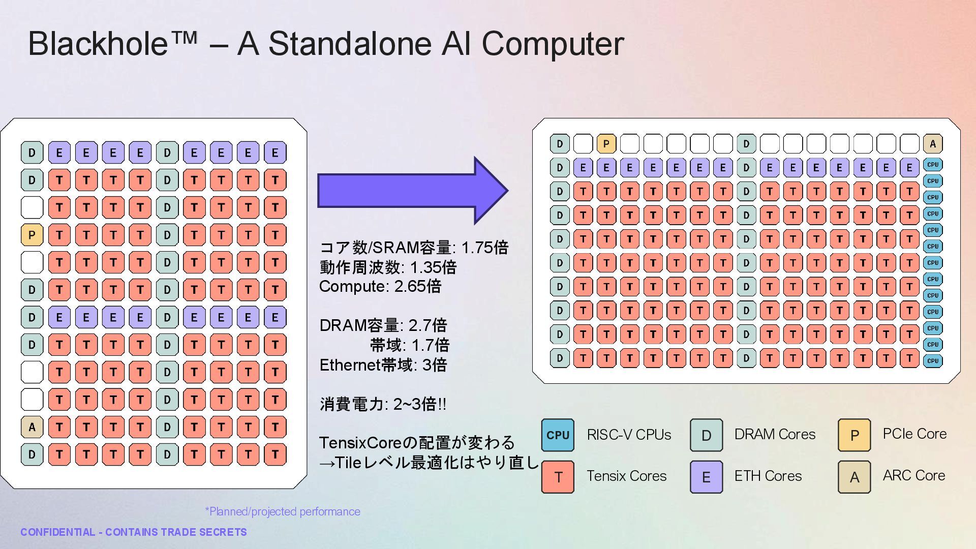 SECRETS *Planned/projected performance Tensix Cores DRAM Cores ETH Cores PCIe Core ARC Core T D E P A CPU RISC-V CPUs コア数/SRAM容量: 1.75倍 動作周波数: 1.35倍 Compute: 2.65倍 DRAM容量: 2.7倍 帯域: 1.7倍 Ethernet帯域: 3倍 消費電力: 2~3倍!! TensixCoreの配置が変わる →Tileレベル最適化はやり直し