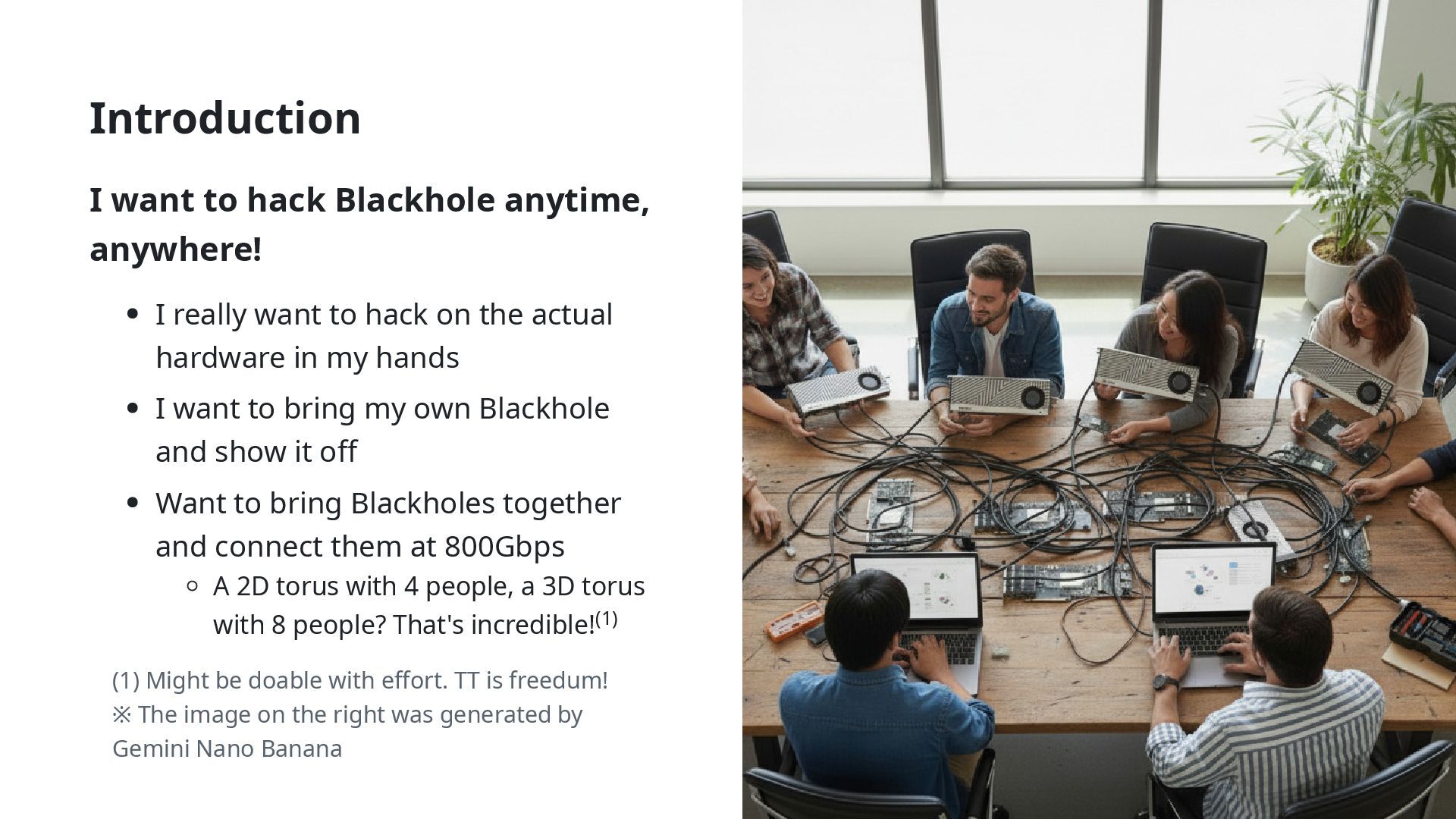 want to hack on the actual hardware in my hands I want to bring my own Blackhole and show it off Want to bring Blackholes together and connect them at 800Gbps A 2D torus with 4 people, a 3D torus with 8 people? That's incredible! (1) Might be doable with effort. TT is freedum! ※ The image on the right was generated by Gemini Nano Banana (1)