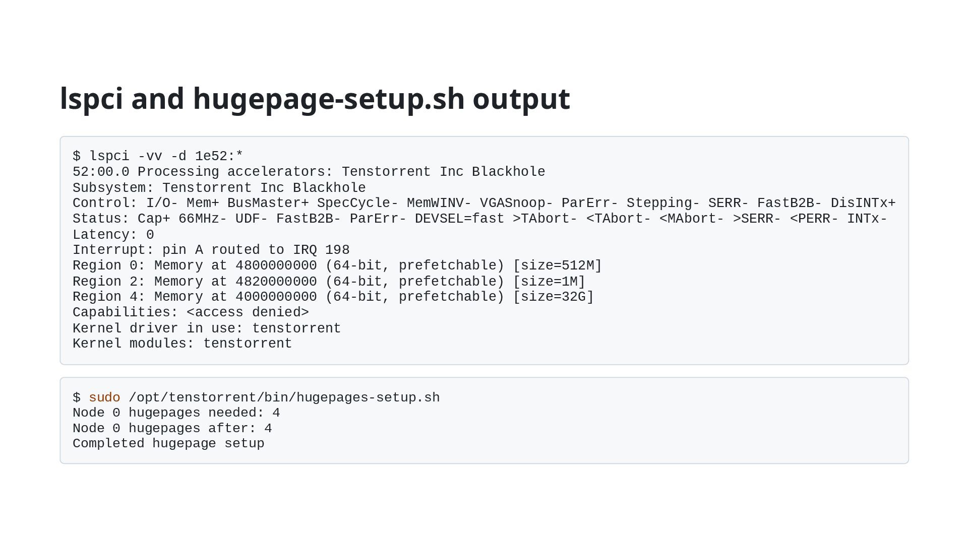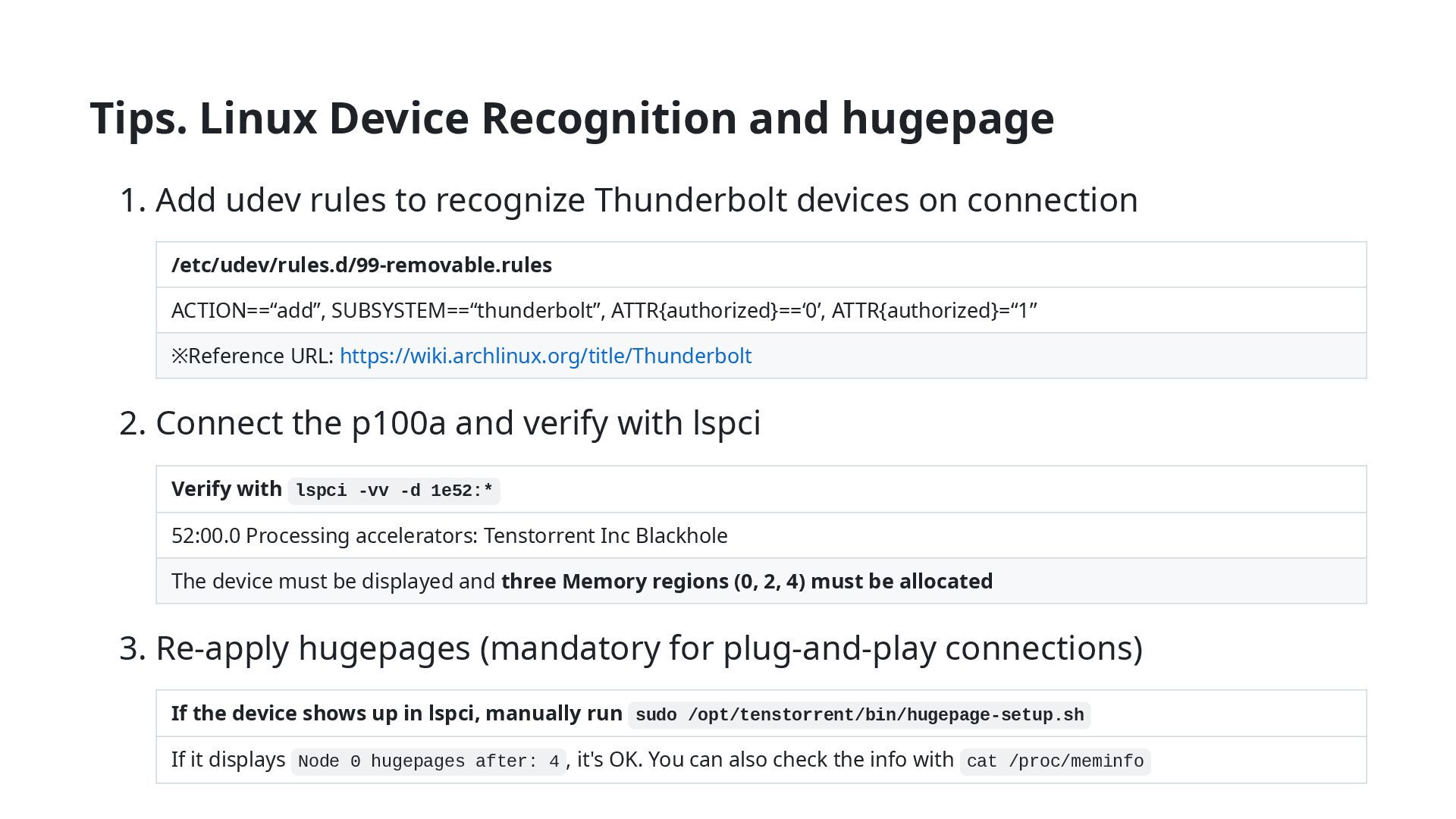 to recognize Thunderbolt devices on connection /etc/udev/rules.d/99-removable.rules ACTION==“add”, SUBSYSTEM==“thunderbolt”, ATTR{authorized}==‘0’, ATTR{authorized}=“1” ※Reference URL: https://wiki.archlinux.org/title/Thunderbolt 2. Connect the p100a and verify with lspci Verify with lspci -vv -d 1e52:* 52:00.0 Processing accelerators: Tenstorrent Inc Blackhole The device must be displayed and three Memory regions (0, 2, 4) must be allocated 3. Re-apply hugepages (mandatory for plug-and-play connections) If the device shows up in lspci, manually run sudo /opt/tenstorrent/bin/hugepage-setup.sh If it displays Node 0 hugepages after: 4 , it's OK. You can also check the info with cat /proc/meminfo