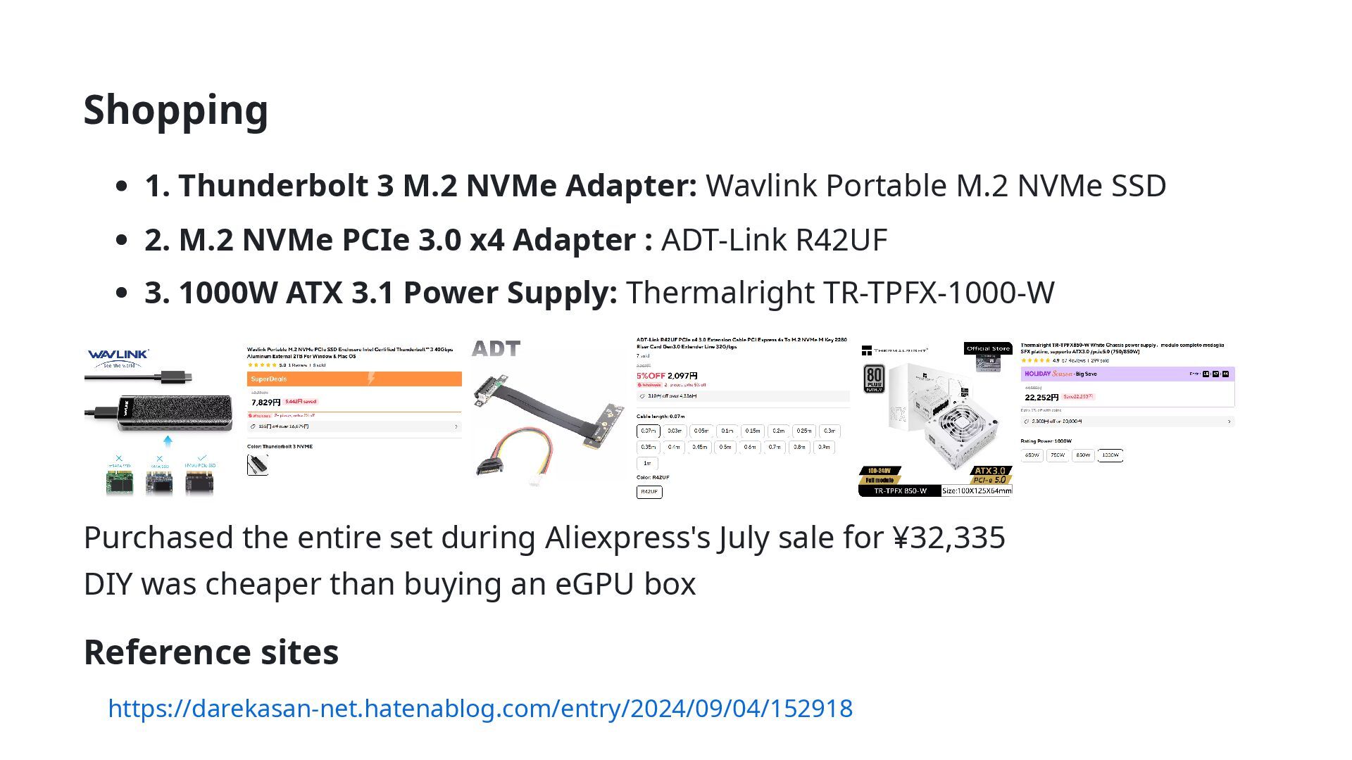 NVMe SSD 2. M.2 NVMe PCIe 3.0 x4 Adapter : ADT-Link R42UF 3. 1000W ATX 3.1 Power Supply: Thermalright TR-TPFX-1000-W Purchased the entire set during Aliexpress's July sale for ¥32,335 DIY was cheaper than buying an eGPU box Reference sites https://darekasan-net.hatenablog.com/entry/2024/09/04/152918