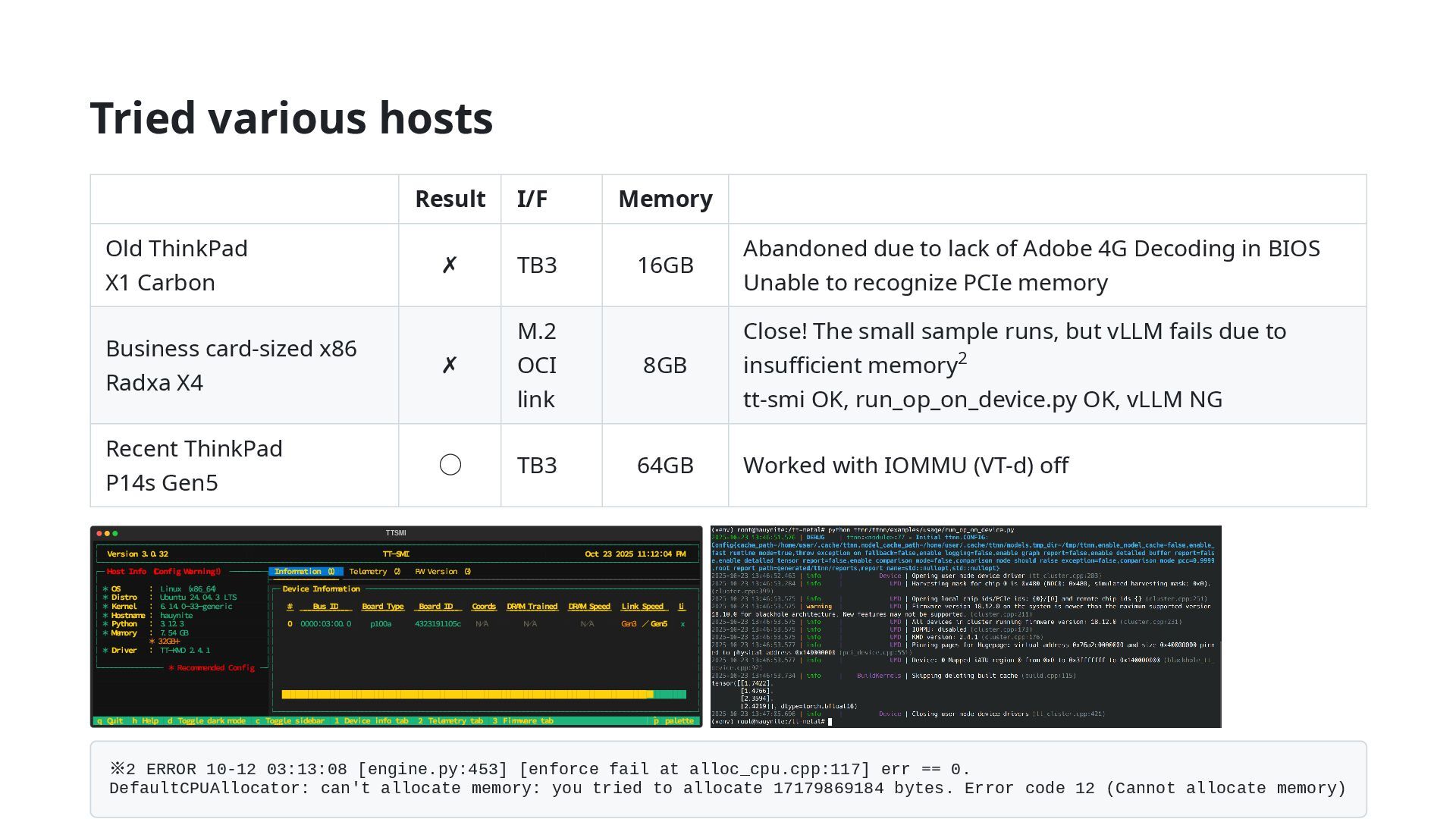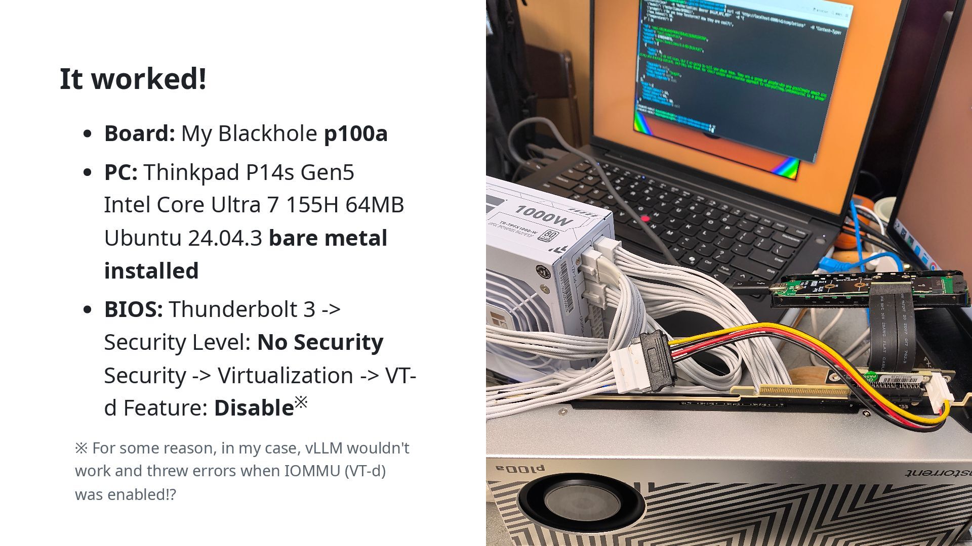 Intel Core Ultra 7 155H 64MB Ubuntu 24.04.3 bare metal installed BIOS: Thunderbolt 3 -> Security Level: No Security Security -> Virtualization -> VT- d Feature: Disable ※ For some reason, in my case, vLLM wouldn't work and threw errors when IOMMU (VT-d) was enabled!? ※