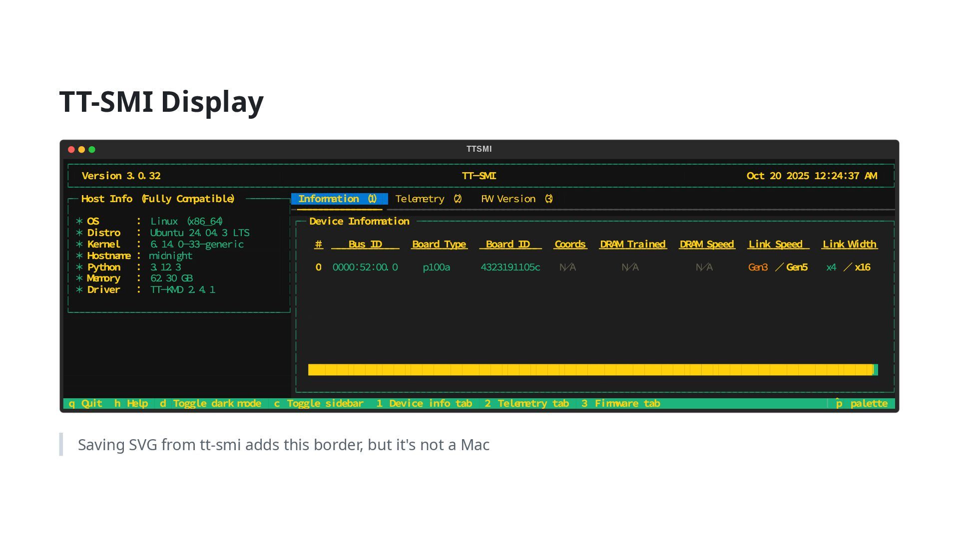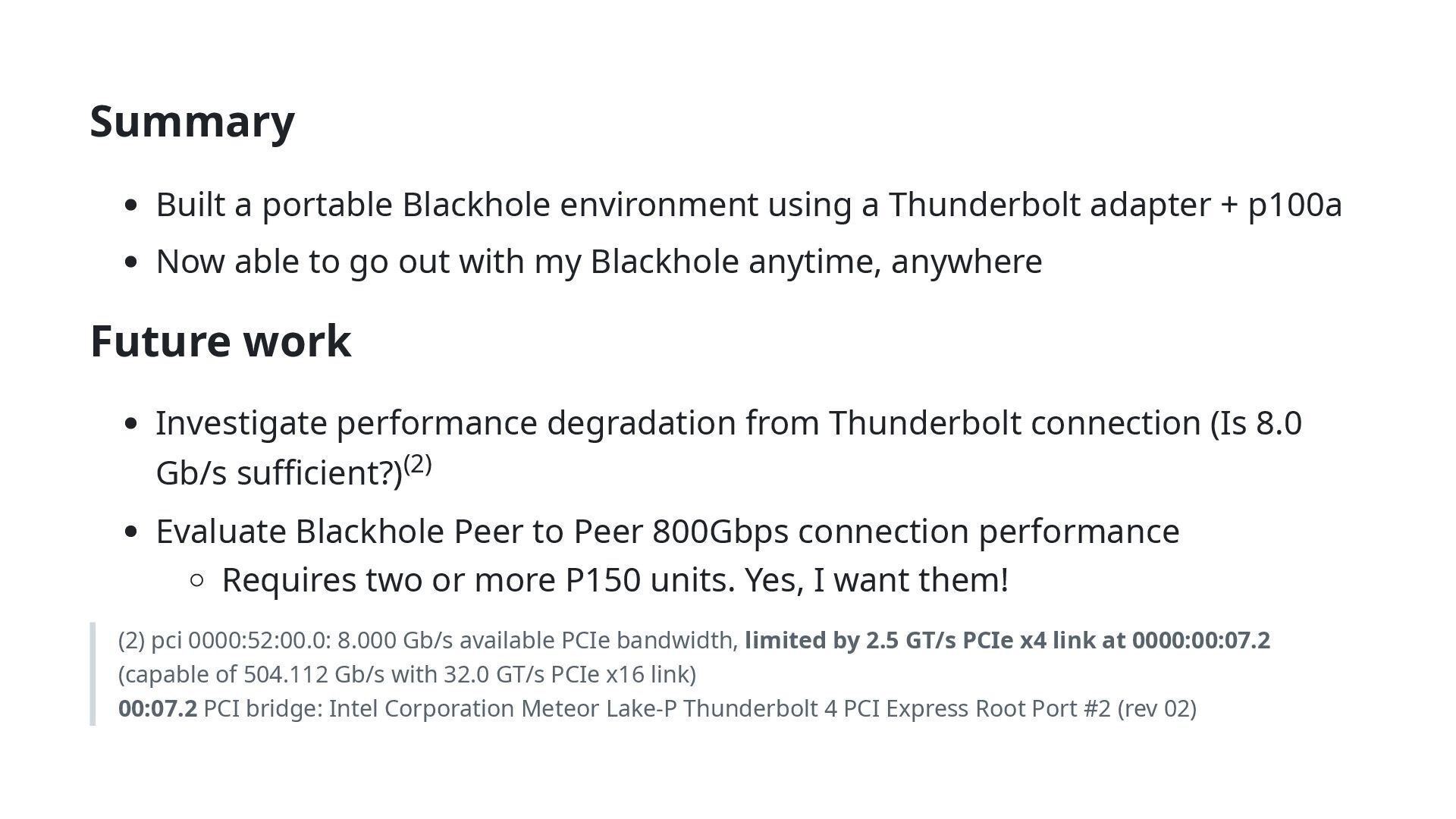 + p100a Now able to go out with my Blackhole anytime, anywhere Future work Investigate performance degradation from Thunderbolt connection (Is 8.0 Gb/s sufficient?) Evaluate Blackhole Peer to Peer 800Gbps connection performance Requires two or more P150 units. Yes, I want them! (2) pci 0000:52:00.0: 8.000 Gb/s available PCIe bandwidth, limited by 2.5 GT/s PCIe x4 link at 0000:00:07.2 (capable of 504.112 Gb/s with 32.0 GT/s PCIe x16 link) 00:07.2 PCI bridge: Intel Corporation Meteor Lake-P Thunderbolt 4 PCI Express Root Port #2 (rev 02) (2)