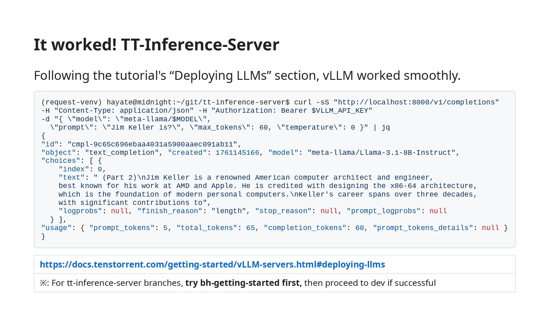 worked smoothly. (request-venv) hayate@midnight:~/git/tt-inference-server$ curl -sS "http://localhost:8000/v1/completions" -H "Content-Type: application/json" -H "Authorization: Bearer $VLLM_API_KEY" -d "{ \"model\": \"meta-llama/$MODEL\", \"prompt\": \"Jim Keller is?\", \"max_tokens\": 60, \"temperature\": 0 }" | jq { "id": "cmpl-9c65c696ebaa4031a5900aaec091ab11", "object": "text_completion", "created": 1761145166, "model": "meta-llama/Llama-3.1-8B-Instruct", "choices": [ { "index": 0, "text": " (Part 2)\nJim Keller is a renowned American computer architect and engineer, best known for his work at AMD and Apple. He is credited with designing the x86-64 architecture, which is the foundation of modern personal computers.\nKeller's career spans over three decades, with significant contributions to", "logprobs": null, "finish_reason": "length", "stop_reason": null, "prompt_logprobs": null } ], "usage": { "prompt_tokens": 5, "total_tokens": 65, "completion_tokens": 60, "prompt_tokens_details": null } } https://docs.tenstorrent.com/getting-started/vLLM-servers.html#deploying-llms ※: For tt-inference-server branches, try bh-getting-started first, then proceed to dev if successful