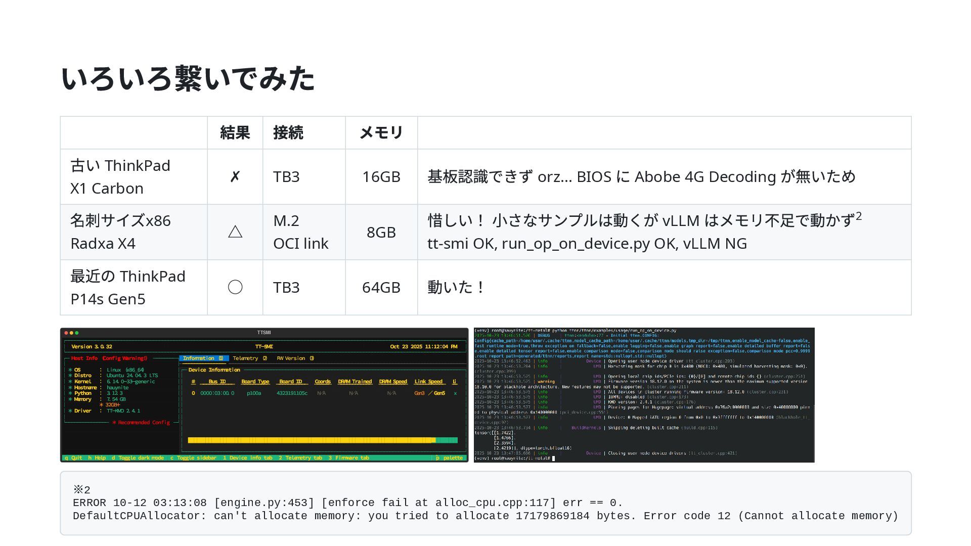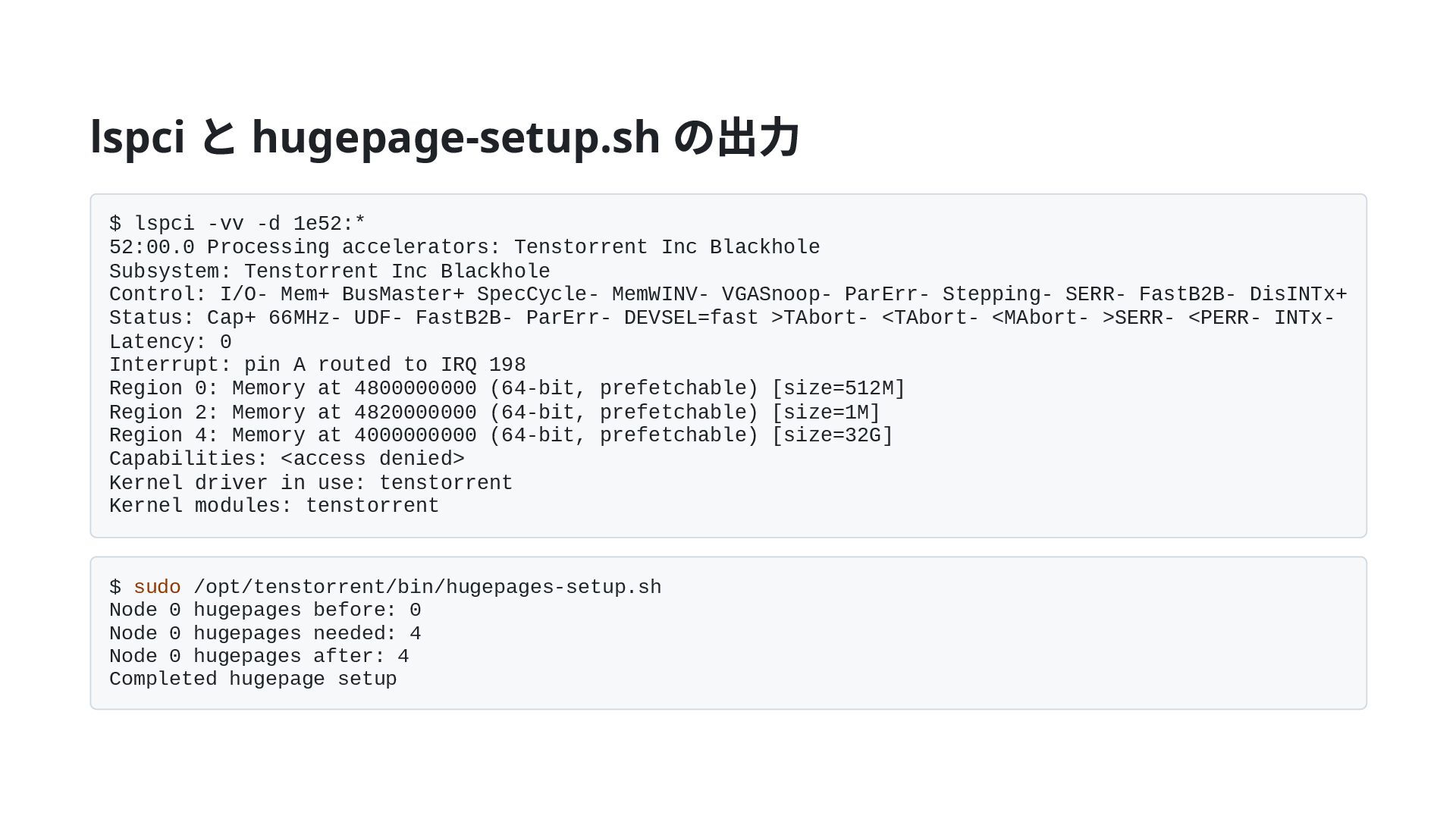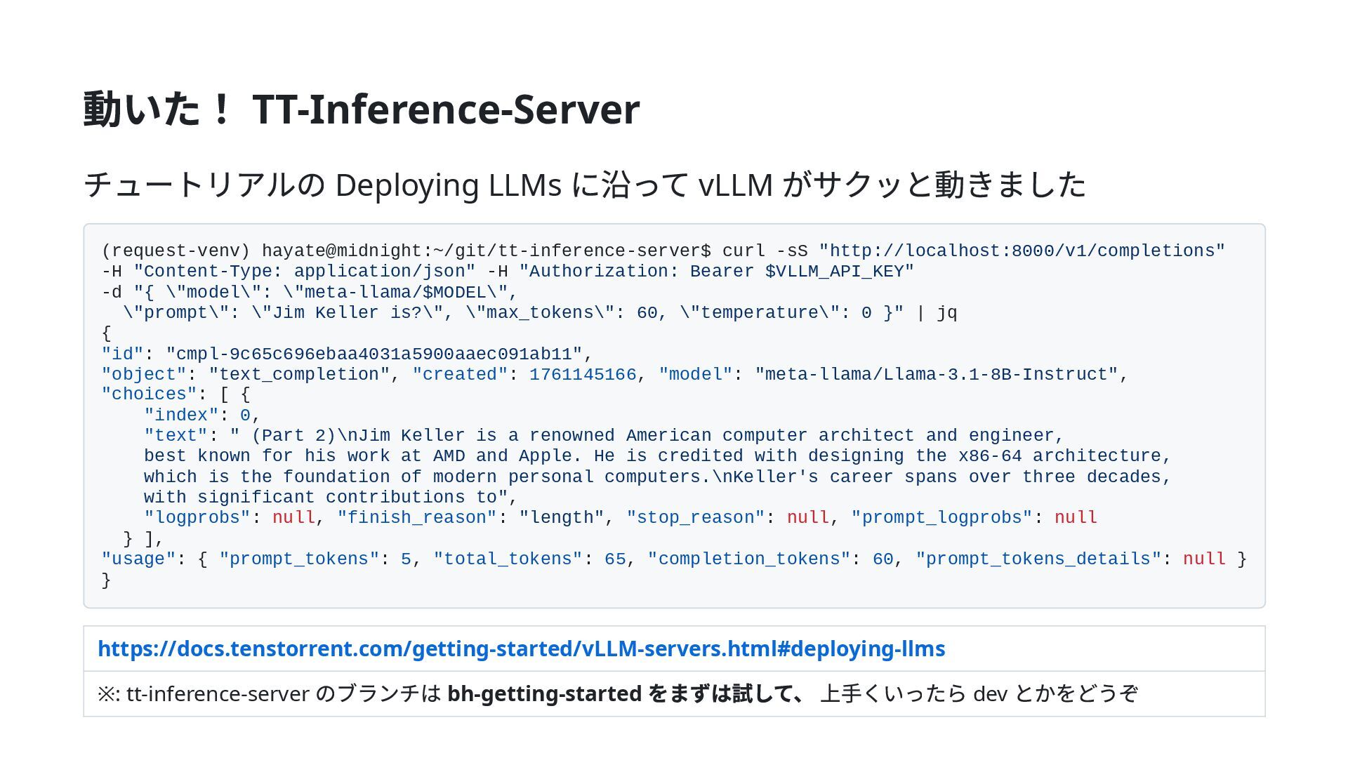 curl -sS "http://localhost:8000/v1/completions" -H "Content-Type: application/json" -H "Authorization: Bearer $VLLM_API_KEY" -d "{ \"model\": \"meta-llama/$MODEL\", \"prompt\": \"Jim Keller is?\", \"max_tokens\": 60, \"temperature\": 0 }" | jq { "id": "cmpl-9c65c696ebaa4031a5900aaec091ab11", "object": "text_completion", "created": 1761145166, "model": "meta-llama/Llama-3.1-8B-Instruct", "choices": [ { "index": 0, "text": " (Part 2)\nJim Keller is a renowned American computer architect and engineer, best known for his work at AMD and Apple. He is credited with designing the x86-64 architecture, which is the foundation of modern personal computers.\nKeller's career spans over three decades, with significant contributions to", "logprobs": null, "finish_reason": "length", "stop_reason": null, "prompt_logprobs": null } ], "usage": { "prompt_tokens": 5, "total_tokens": 65, "completion_tokens": 60, "prompt_tokens_details": null } } https://docs.tenstorrent.com/getting-started/vLLM-servers.html#deploying-llms ※: tt-inference-server のブランチは bh-getting-started をまずは試して、 上手くいったら dev とかをどうぞ