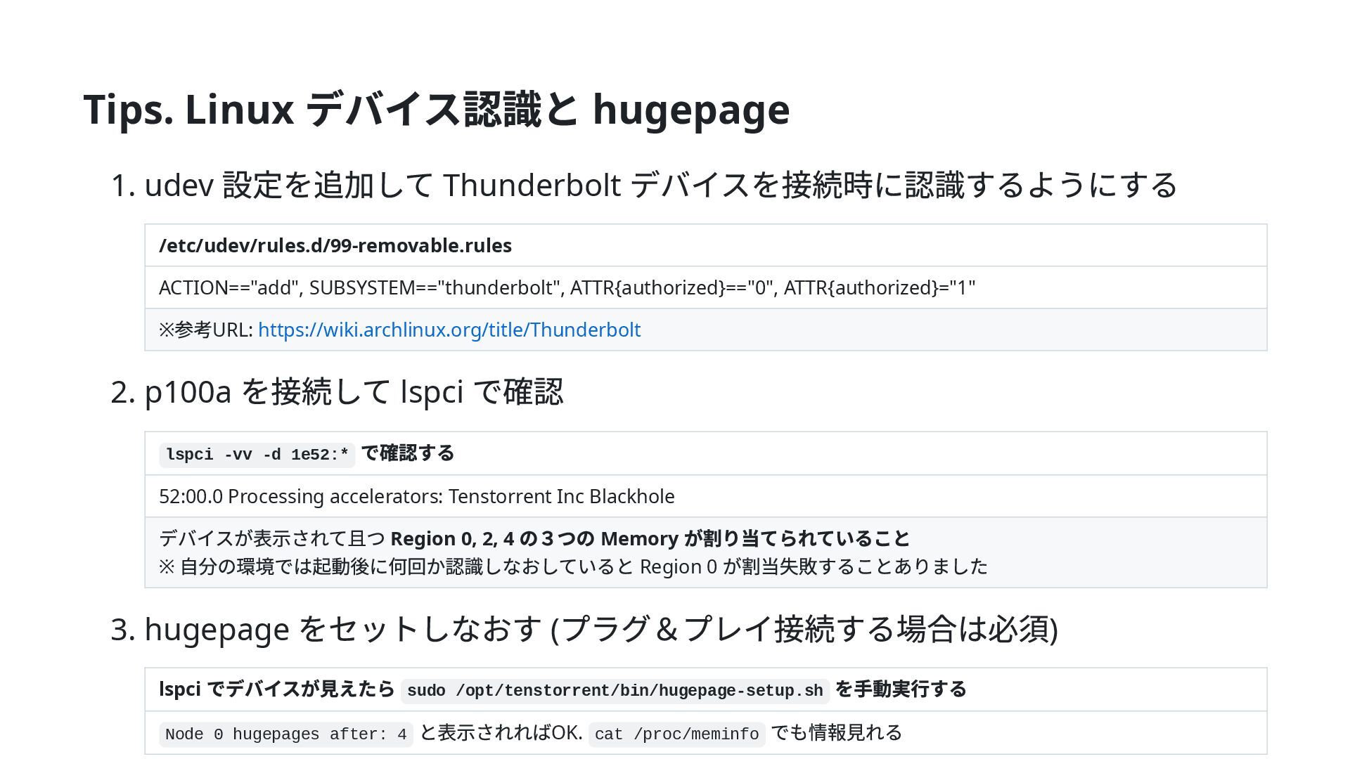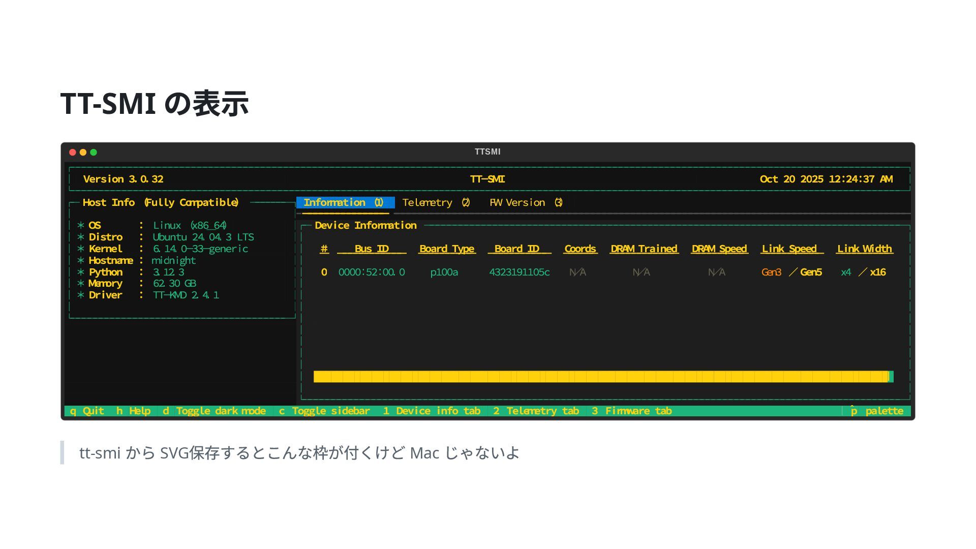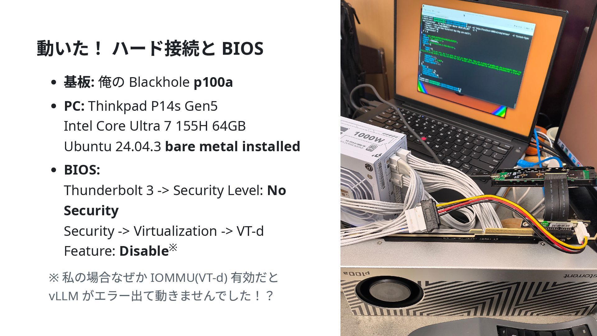 curl -sS "http://localhost:8000/v1/completions" -H "Content-Type: application/json" -H "Authorization: Bearer $VLLM_API_KEY" -d "{ \"model\": \"meta-llama/$MODEL\", \"prompt\": \"Jim Keller is?\", \"max_tokens\": 60, \"temperature\": 0 }" | jq { "id": "cmpl-9c65c696ebaa4031a5900aaec091ab11", "object": "text_completion", "created": 1761145166, "model": "meta-llama/Llama-3.1-8B-Instruct", "choices": [ { "index": 0, "text": " (Part 2)\nJim Keller is a renowned American computer architect and engineer, best known for his work at AMD and Apple. He is credited with designing the x86-64 architecture, which is the foundation of modern personal computers.\nKeller's career spans over three decades, with significant contributions to", "logprobs": null, "finish_reason": "length", "stop_reason": null, "prompt_logprobs": null } ], "usage": { "prompt_tokens": 5, "total_tokens": 65, "completion_tokens": 60, "prompt_tokens_details": null } } https://docs.tenstorrent.com/getting-started/vLLM-servers.html#deploying-llms ※: tt-inference-server のブランチは bh-getting-started をまずは試して、 上手くいったら dev とかをどうぞ