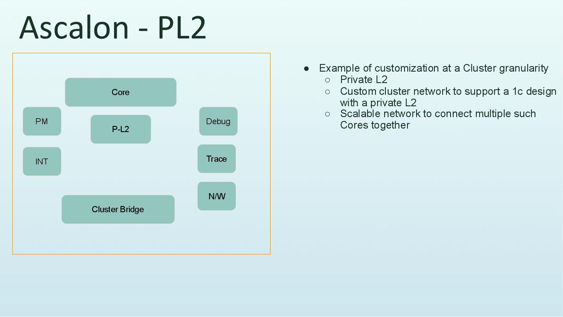 granularity ◦ Private L2 ◦ Custom cluster network to support a 1c design with a private L2 ◦ Scalable network to connect multiple such Cores together Core P-L2 Cluster Bridge Debug Trace N/W PM INT