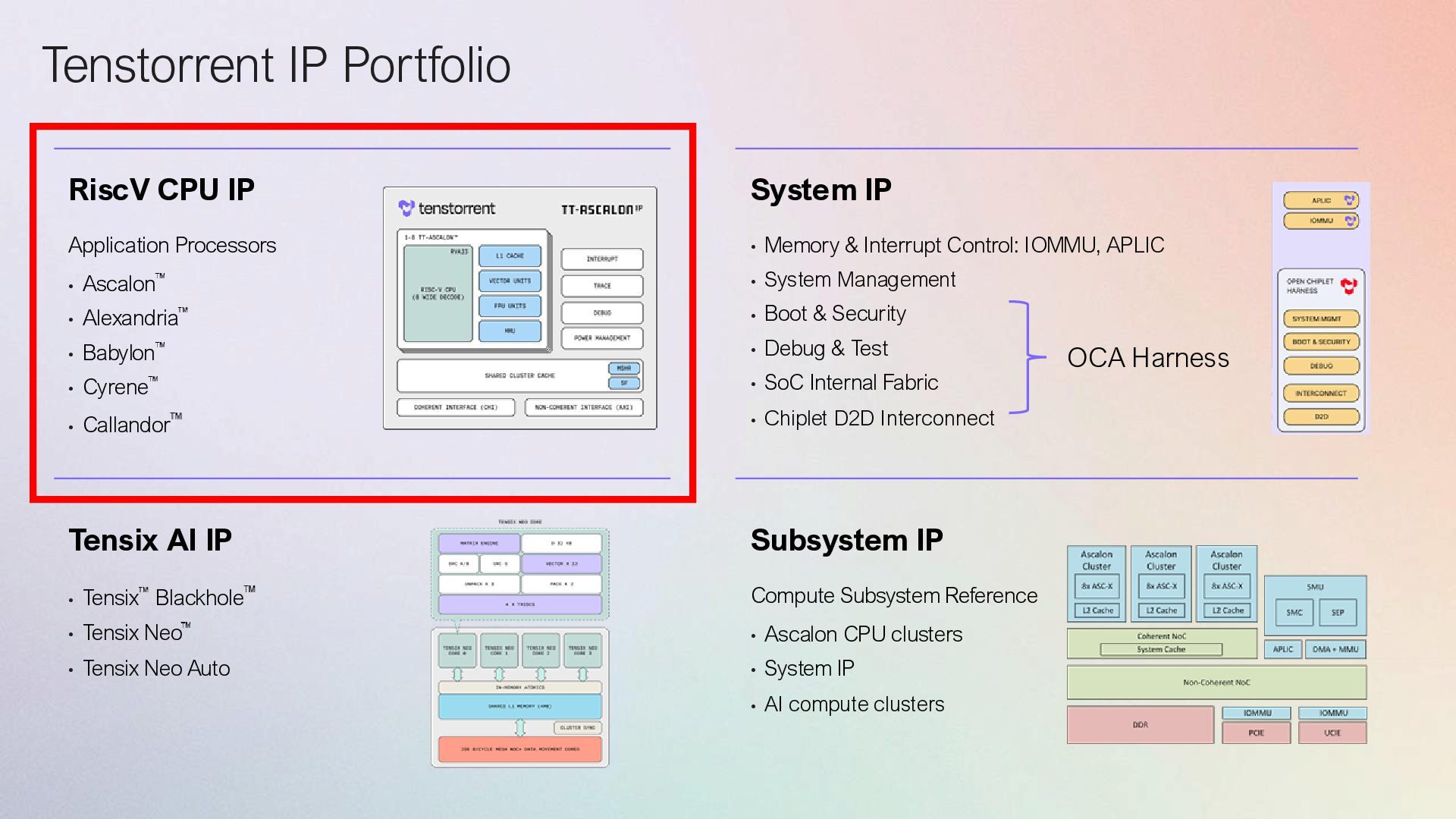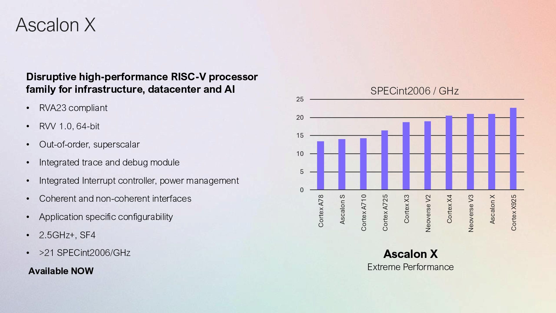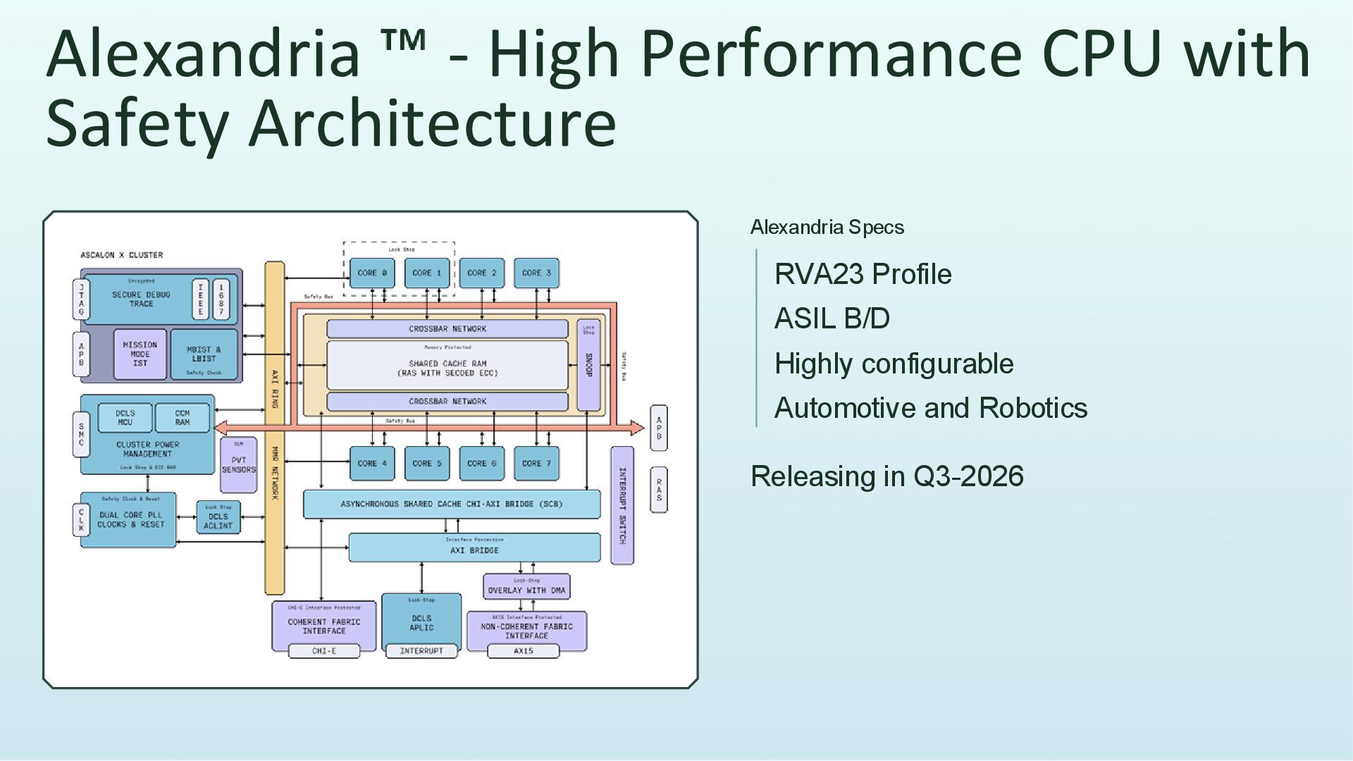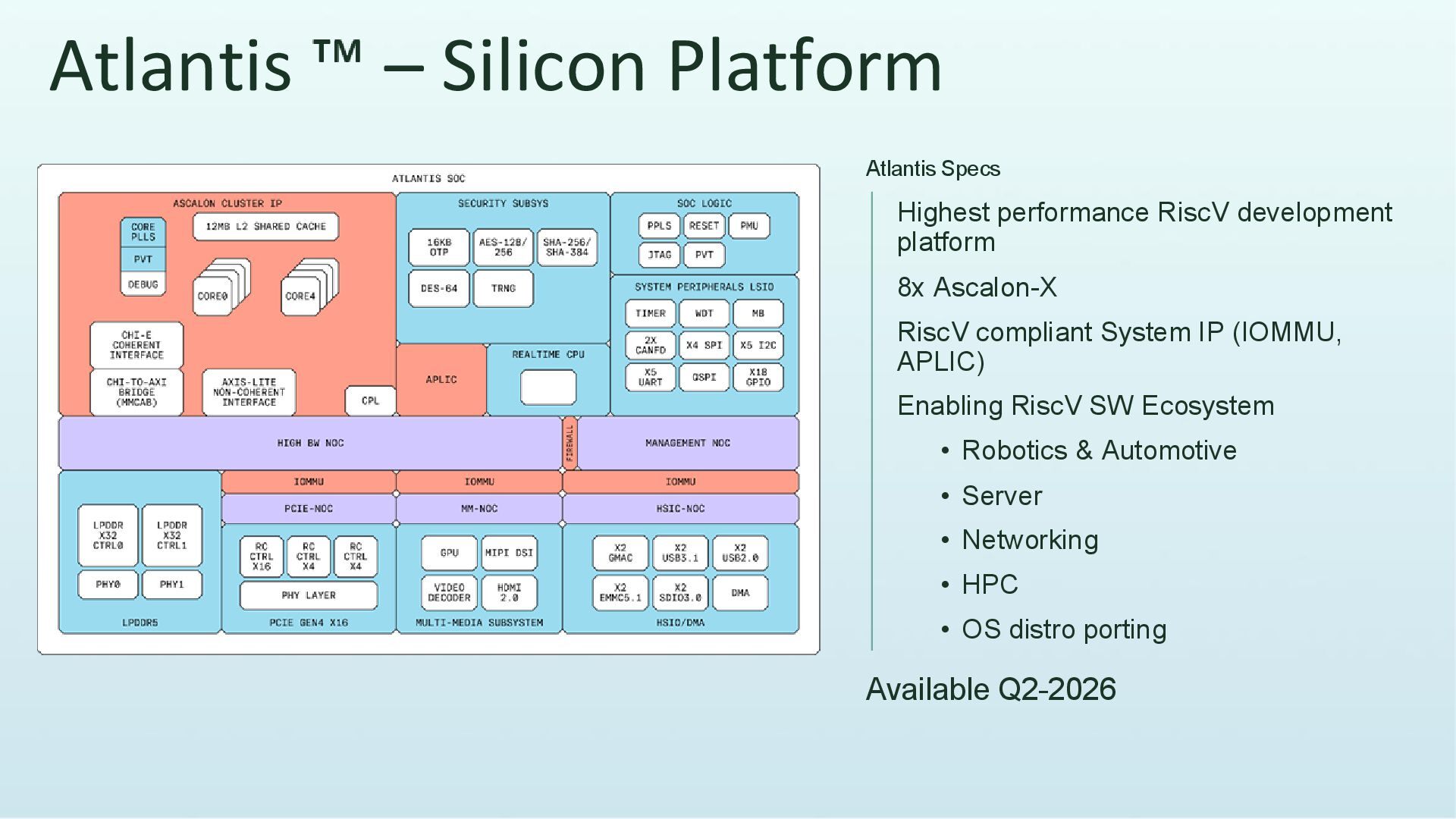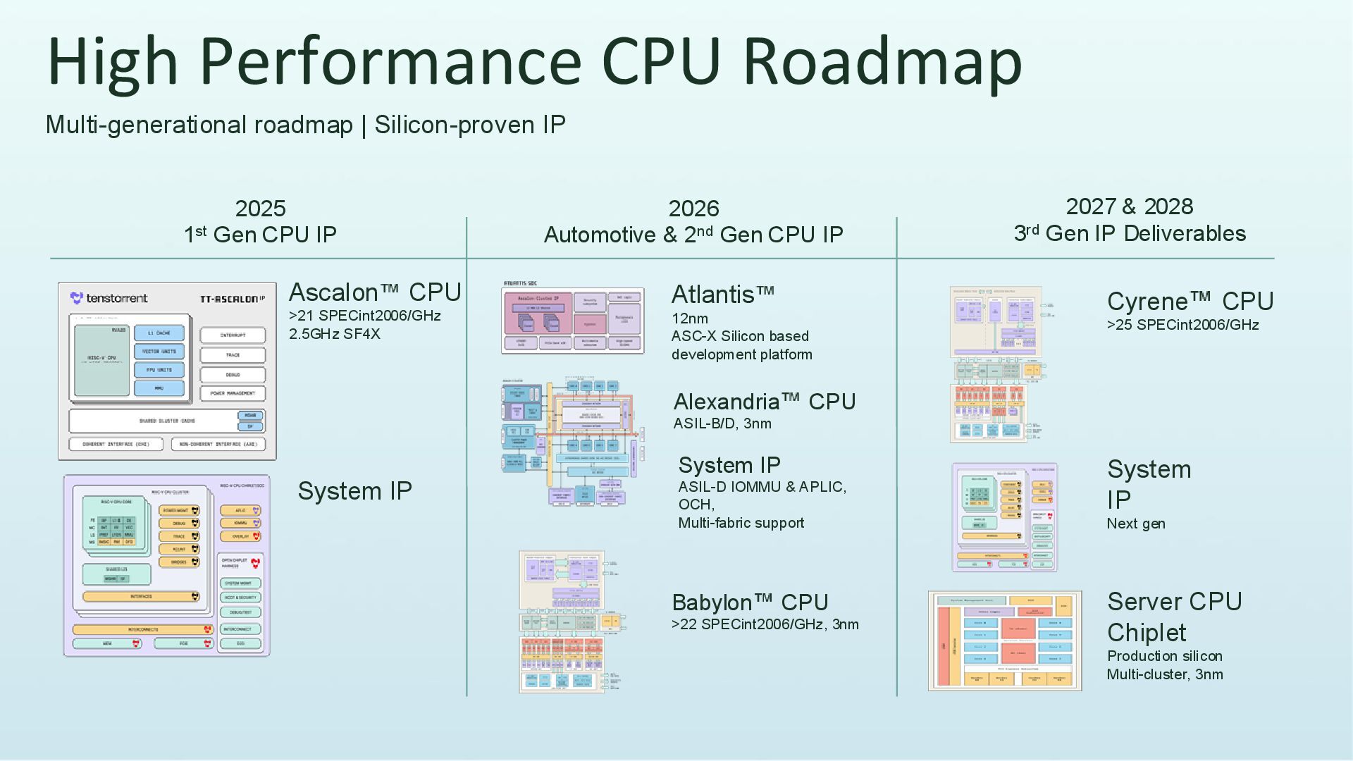 CPU >21 SPECint2006/GHz 2.5GHz SF4X System IP 2025 1st Gen CPU IP 2026 Automotive & 2nd Gen CPU IP 2027 & 2028 3rd Gen IP Deliverables Babylon CPU >22 SPECint2006/GHz, 3nm Atlantis 12nm ASC-X Silicon based development platform System IP ASIL-D IOMMU & APLIC, OCH, Multi-fabric support Cyrene CPU >25 SPECint2006/GHz System IP Next gen Server CPU Chiplet Production silicon Multi-cluster, 3nm Alexandria CPU ASIL-B/D, 3nm