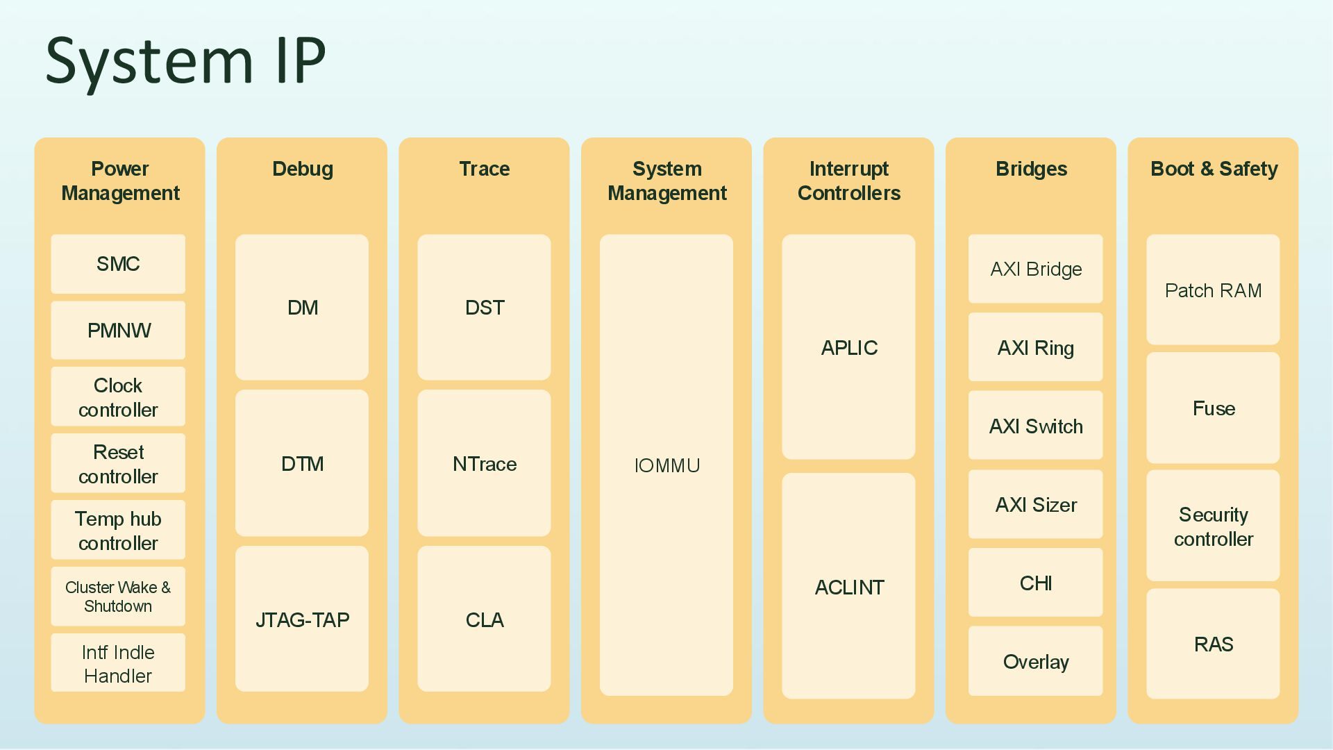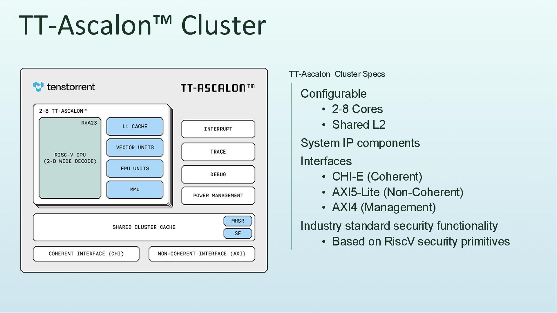 IP components Interfaces • CHI-E (Coherent) • AXI5-Lite (Non-Coherent) • AXI4 (Management) Industry standard security functionality • Based on RiscV security primitives TT-Ascalon Cluster Specs