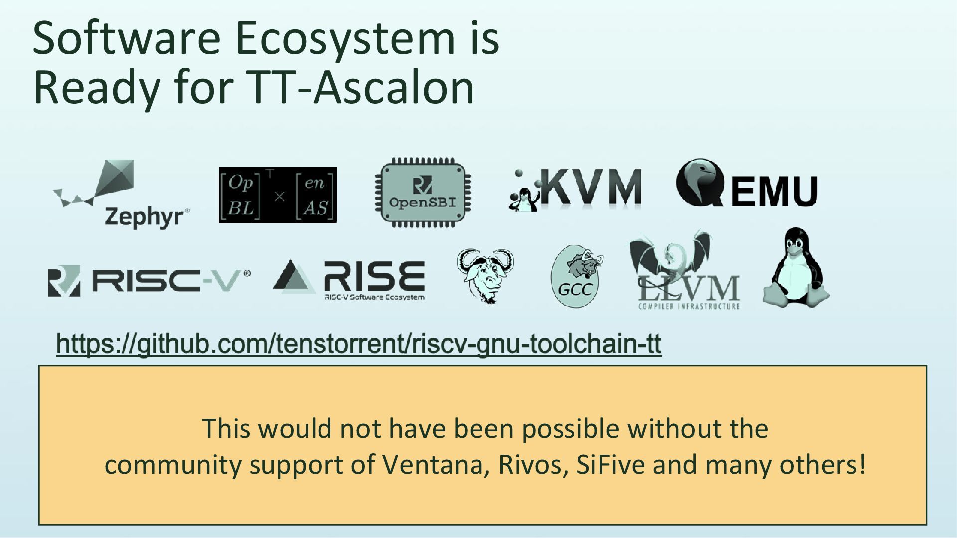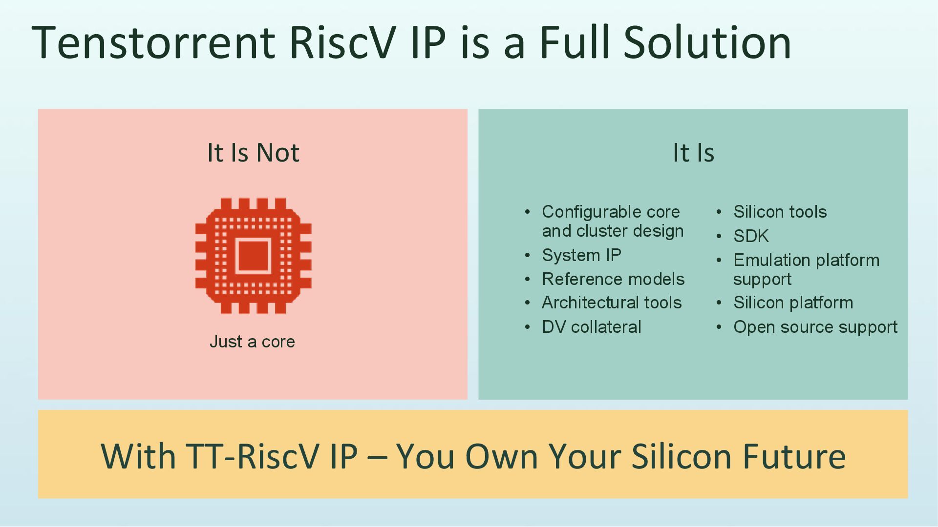 and cluster design • System IP • Reference models • Architectural tools • DV collateral With TT-RiscV IP – You Own Your Silicon Future It Is Not It Is • Silicon tools • SDK • Emulation platform support • Silicon platform • Open source support Just a core