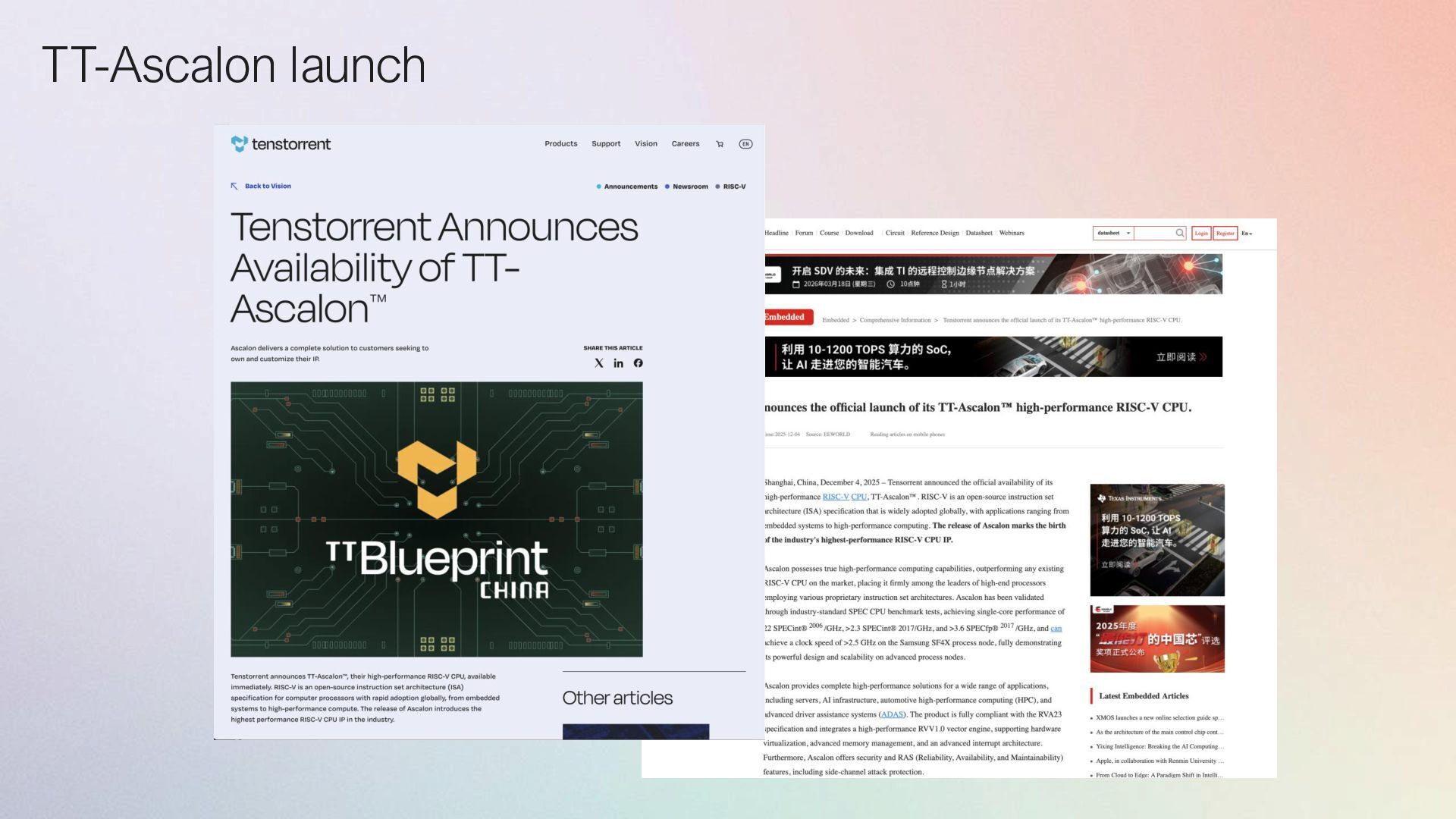 and AI RVA23 2.5GHz SF4X High performance Vector Unit with 256b wide datapath Advanced branch prediction, prefetchers Virtualization, Security, Side channel mitigations, RAS GCC / LLVM support released TT-Ascalon-X Specs Available NOW! >21 SPECint2006/GHz >2.3 SPECint2017/GHz >4.1 SPECfp2017/GHz