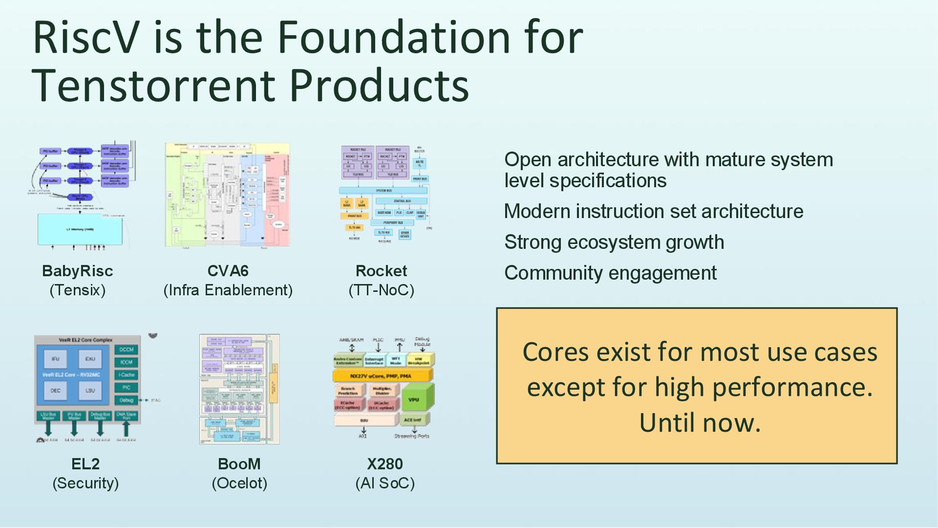 mature system level specifications Modern instruction set architecture Strong ecosystem growth Community engagement BabyRisc (Tensix) CVA6 (Infra Enablement) Rocket (TT-NoC) EL2 (Security) BooM (Ocelot) X280 (AI SoC) Cores exist for most use cases except for high performance. Until now.