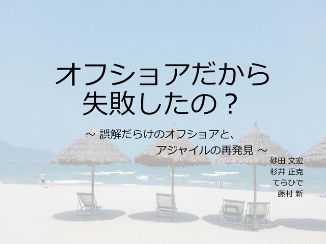 オフショアだから 失敗したの? 〜 誤解だらけのオフショアと、 アジャイルの再発見 〜 砂田 文宏 杉井 正克