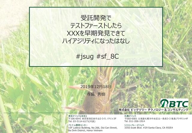No.266, Doi Can Street, Ba Dinh District, Hanoi Vietnam 札幌オフィス 〒060-0001 北海道札幌市中央区北一条西3-3 敷島プラザビル4F Tel. 011-206-1914 シリコンバレーオフィス 3350 Scott Blvd. #29 Santa Clara, CA 95054 受託開発で テストファーストしたら XXXを早期発見できて ハイアジリティになったはなし #jsug #sf_8C 2019年12月18日 寺島 秀樹