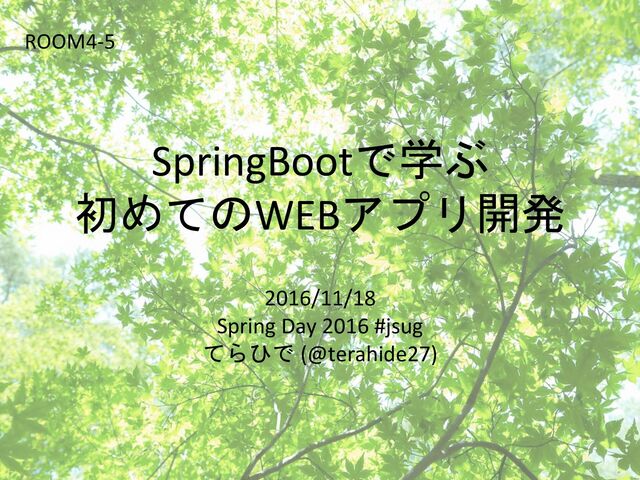 SpringBootで学ぶ 初めてのWEBアプリ開発 2016/11/18 Spring Day 2016 #jsug てらひで (@terahide27) ROOM4-5