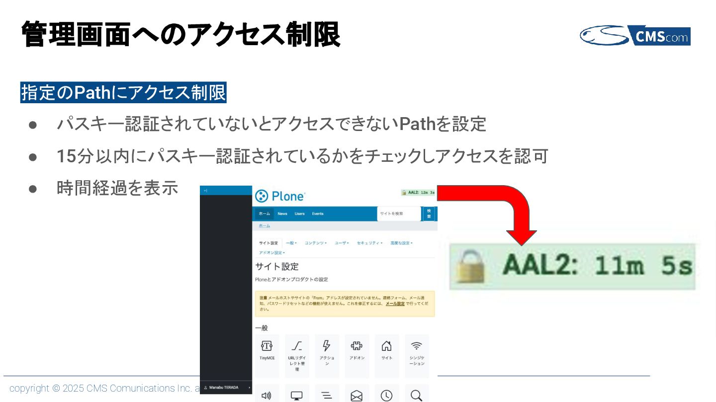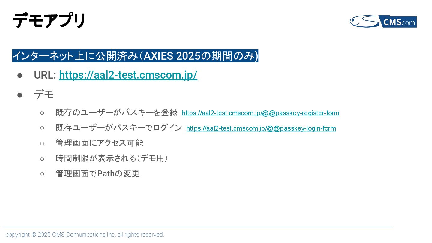 インターネット上に公開済み(AXIES 2025の期間のみ) • URL: https://aal2-test.cmscom.jp/ • デモ ◦ 既存のユーザーがパスキーを登録 https://aal2-test.cmscom.jp/@@passkey-register-form ◦ 既存ユーザーがパスキーでログイン https://aal2-test.cmscom.jp/@@passkey-login-form ◦ 管理画面にアクセス可能 ◦ 時間制限が表示される(デモ用) ◦ 管理画面でPathの変更