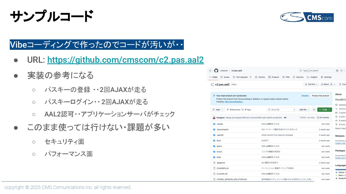 Vibeコーディングで作ったのでコードが汚いが・・ • URL: https://github.com/cmscom/c2.pas.aal2 • 実装の参考になる ◦ パスキーの登録 ・・2回AJAXが走る ◦ パスキーログイン・・ 2回AJAXが走る ◦ AAL2認可・・アプリケーションサーバがチェック • このまま使っては行けない・課題が多い ◦ セキュリティ面 ◦ パフォーマンス面