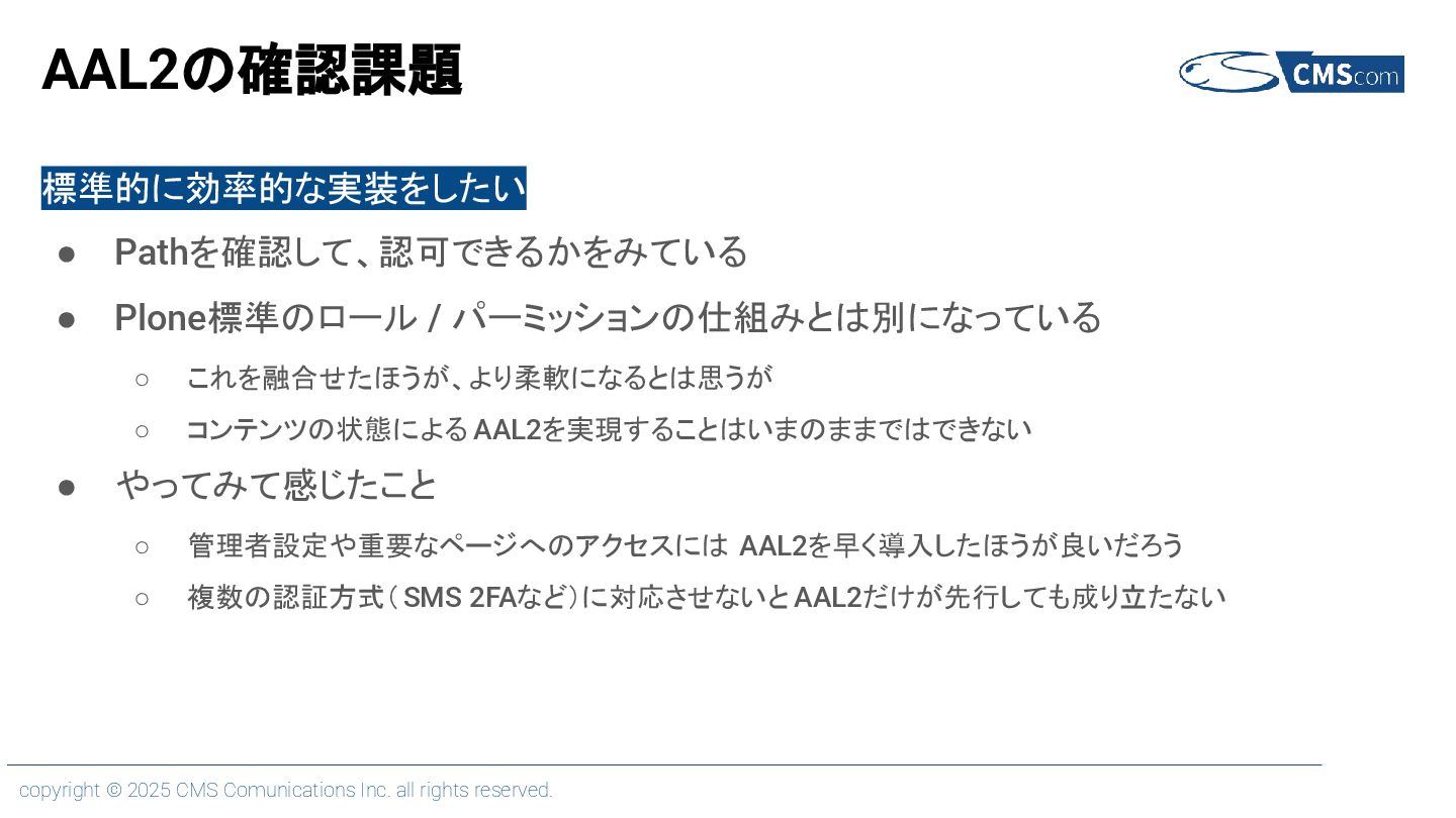 標準的に効率的な実装をしたい • Pathを確認して、認可できるかをみている • Plone標準のロール / パーミッションの仕組みとは別になっている ◦ これを融合せたほうが、より柔軟になるとは思うが ◦ コンテンツの状態による AAL2を実現することはいまのままではできない • やってみて感じたこと ◦ 管理者設定や重要なページへのアクセスには AAL2を早く導入したほうが良いだろう ◦ 複数の認証方式(SMS 2FAなど)に対応させないと AAL2だけが先行しても成り立たない