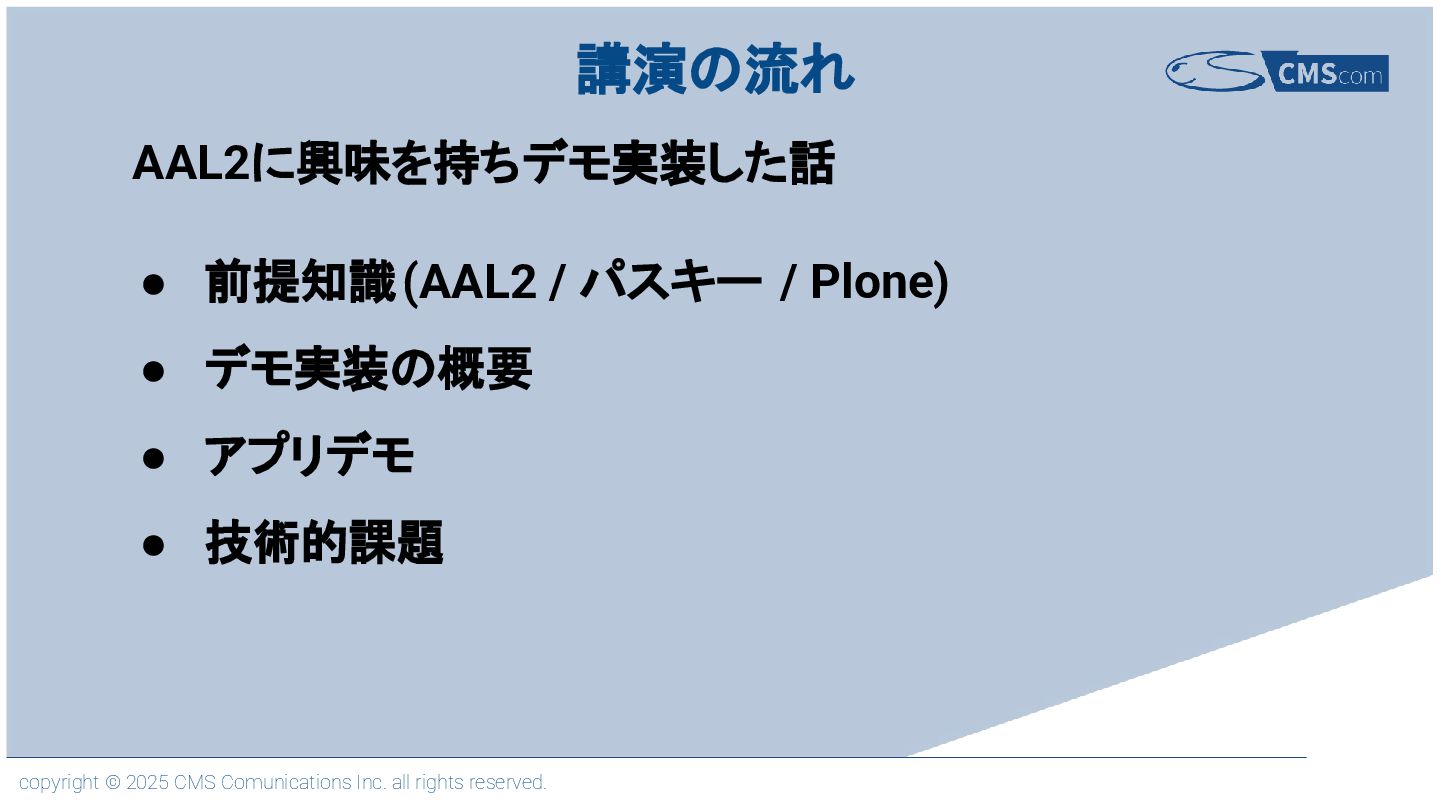 AAL2に興味を持ちデモ実装した話 • 前提知識(AAL2 / パスキー / Plone) • デモ実装の概要 • アプリデモ • 技術的課題