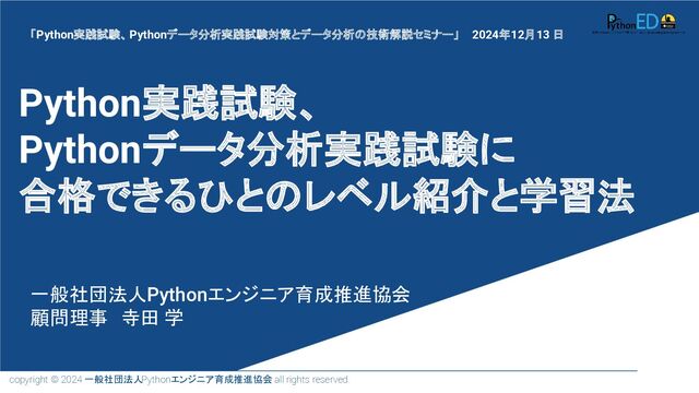 一般社団法人Pythonエンジニア育成推進協会 顧問理事 寺田 学 「Python実践試験、 Pythonデータ分析実践試験対策とデータ分析の技術解説セミナー」 2024年12月13 日