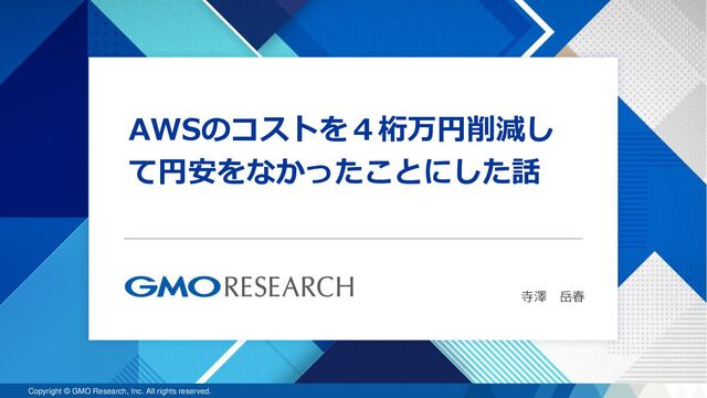 また漏洩することは「著作権法」「不正競争防止法」によって禁じられております。 This document and all information contained in this document are the legal property of GMO Research, Inc. Any distribution, copying, or disclosure of information contained in this document without the consent of GMO Research, Inc. is strictly forbidden by the Japanese Intellectual Property Rights Law and Fair Competition Law.