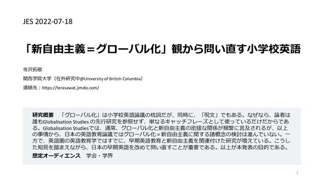 「グローバル化」は小学校英語論議の枕詞だが、同時に、「呪文」でもある。なぜなら、論者は 誰もGlobalisation Studies の先行研究を参照せず、単なるキャッチフレーズとして使っているだけだからであ る。Globalisation Studiesでは、通常、グローバル化と新自由主義の密接な関係が頻繁に言及されるが、以上 の事情から、日本の英語教育論議ではグローバル化=新自由主義に関する諸概念の検討は進んでいない。一 方で、英語圏の英語教育学ではすでに、早期英語教育と新自由主義を関連付けた研究が増えている。こうし た知見を踏まえながら、日本の早期英語を改めて問い直すことが重要である。以上が本発表の目的である。