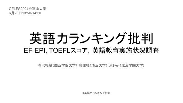 英語力ランキング批判 EF-EPI, TOEFLスコア,英語教育実施状況調査 寺沢拓敬(関西学院大学) 奥住桂(埼玉大学) 浦野研(北海学園大学) CELES2024@富山大学 6月23日13:50-14:20 #英語力ランキング批判