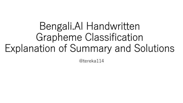 • Grapheme root(169 class) • Vowel diacritic(11 class) • Consonant diacritic(7 class) • Grapheme is 1295 class • But test data have unseen graphemes • Code Competition • 9hours(CPU)/2hours(GPU)