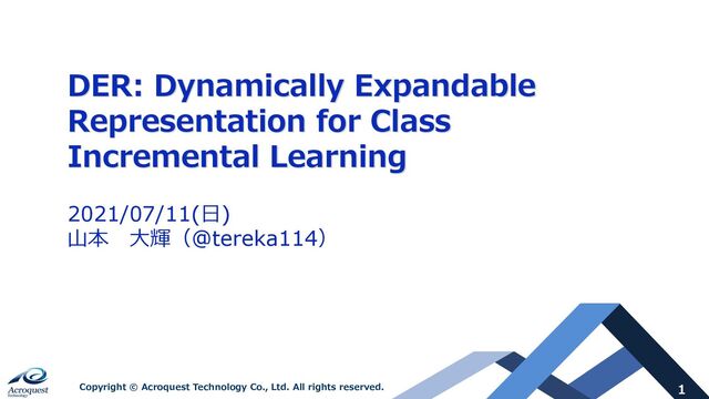 rights reserved. 18 1. 学習の流れは次の通り ① タスクが⼀つ追加されるたびに、⼀つの特徴抽出機を作成する。 – 過去の学習済パラメータは凍結し、学習中も変化がない。 ② 特徴抽出機の出⼒を結合し、分類する。 – Training LossはClassification Loss, Auxiliary Loss, Sparsity Lossの3つに区分され る。(詳細は次のP) 2. Pruning ① Channel-levelでの学習可能なマスクを⽤いてパラメータ数を削減する。