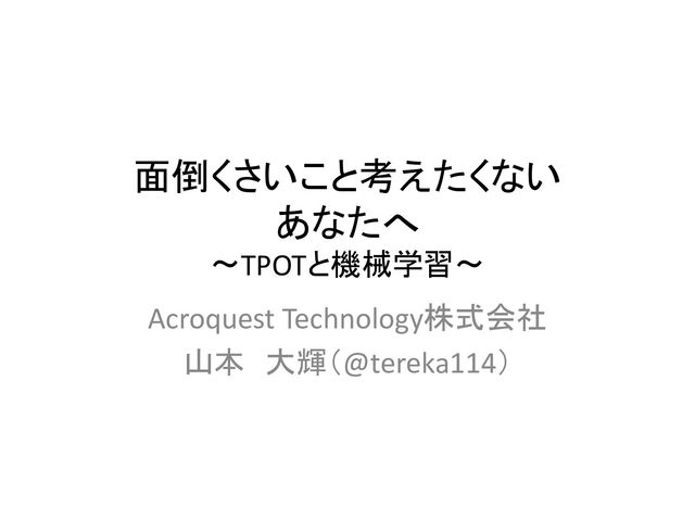 面倒くさいこと考えたくない あなたへ 〜TPOTと機械学習〜 Acroquest Technology株式会社 山本 大輝(@tereka114)