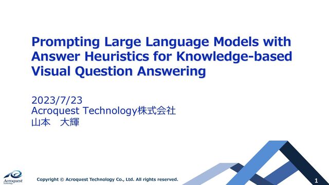 All rights reserved. 12 1.画像と質問を与えたときに答えを導き出す問題 2.通称VQAと呼ばれ、背景知識がないと回答できない KnowledgeベースのVQAをK-VQA(Knowledge Aware)として呼ばれる。 映っているのは教会だが、教会がいつ開いて いるのかを⼀般的に知らないと回答できない。