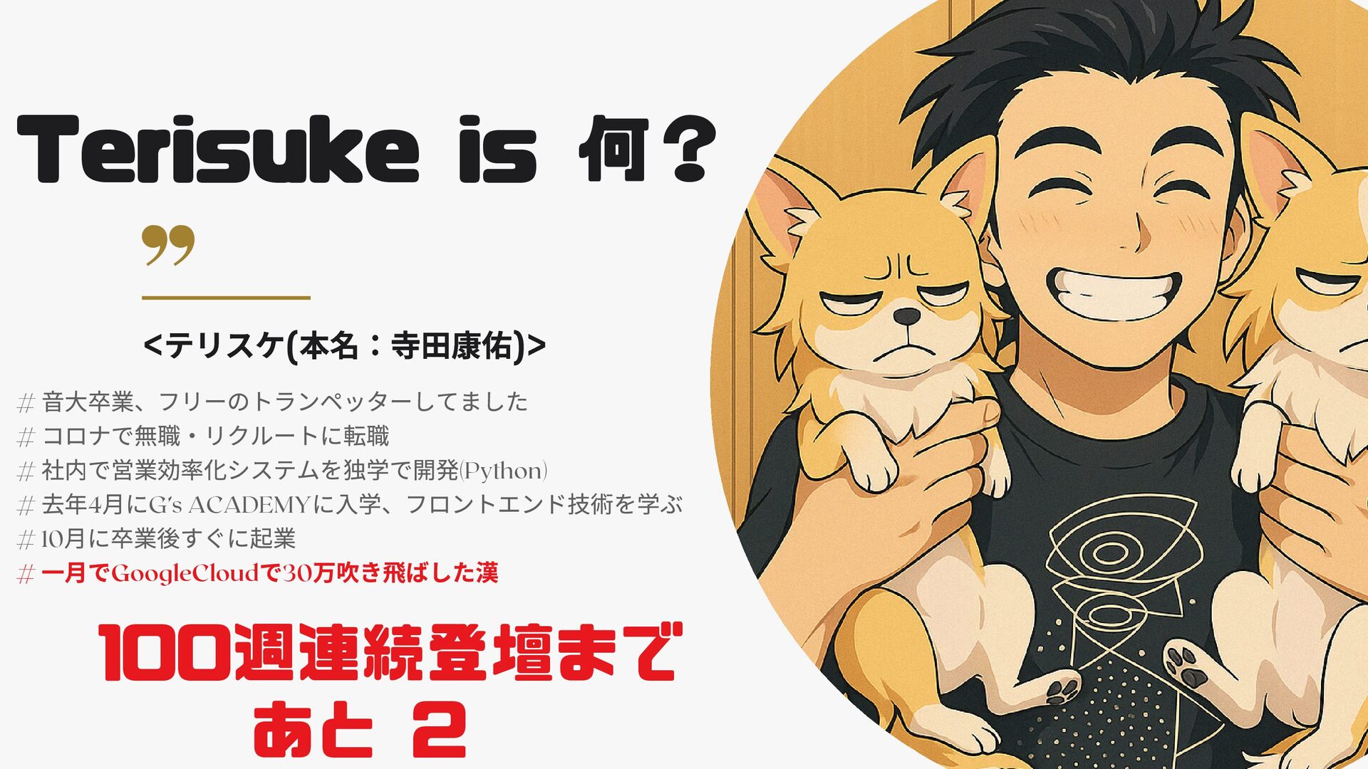 # 社内で営業効率化システムを独学で開発(Python) # 去年4 月にG’s ACADEMY に入学、フロントエンド技術を学ぶ # 10 月に卒業後すぐに起業 # 一⽉でGoogleCloud で30 万吹き飛ばした漢 🎉100週連続登壇まで あと 2