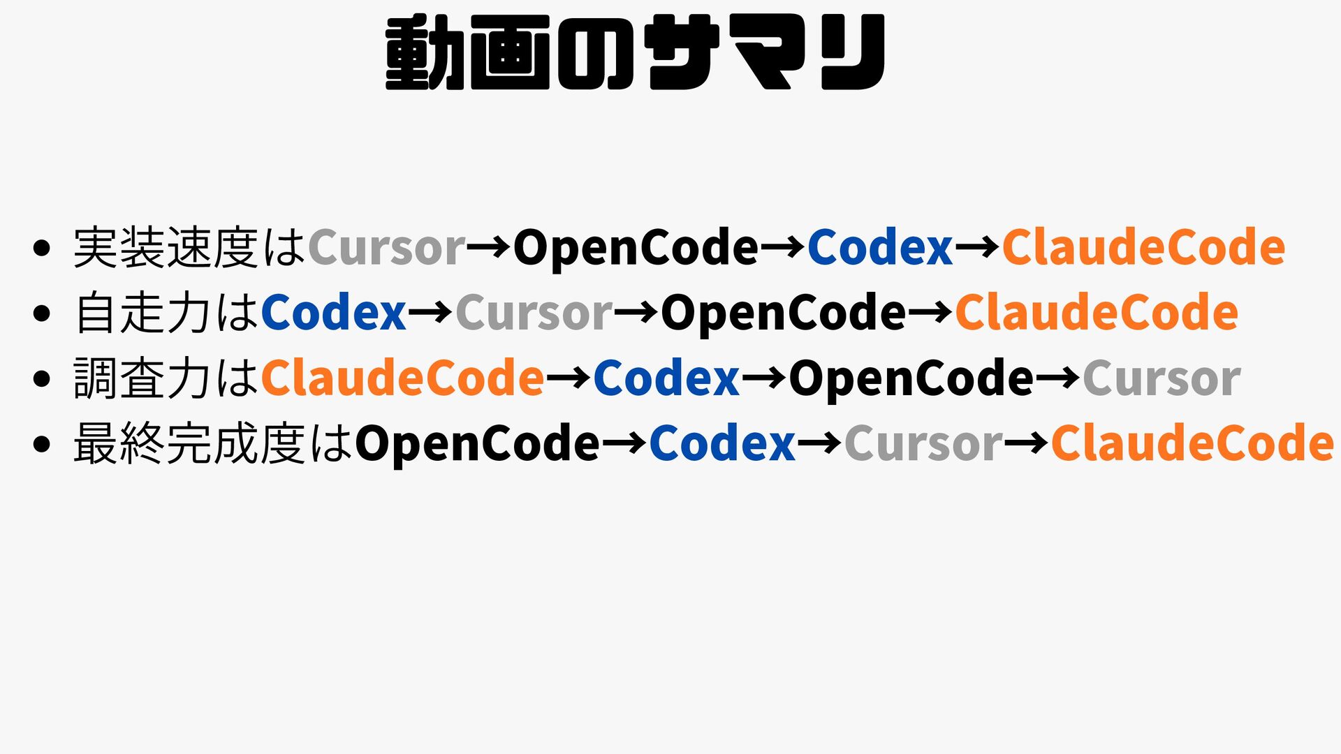 実装速度はCursor→OpenCode→Codex→ClaudeCode 自走力はCodex→Cursor→OpenCode→ClaudeCode 調査力はClaudeCode→Codex→OpenCode→Cursor 最終完成度はOpenCode→Codex→Cursor→ClaudeCode 動画のサマリ