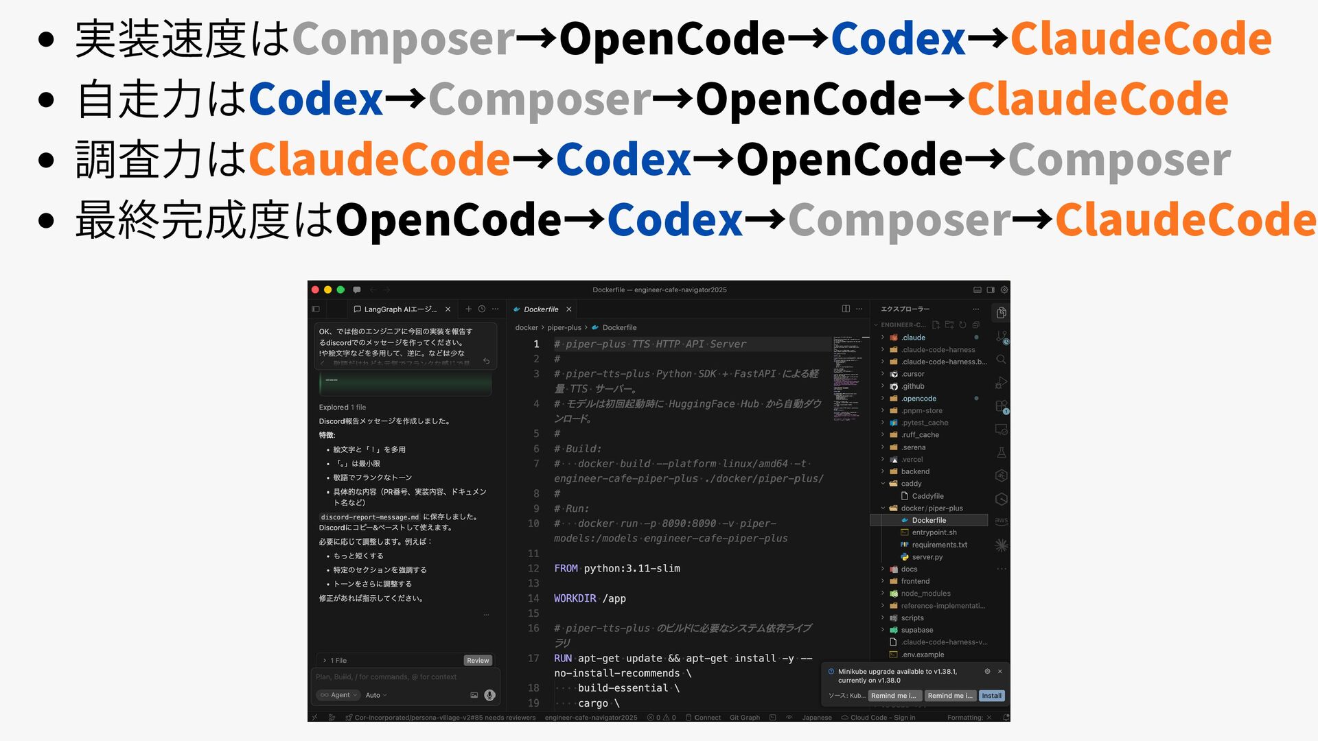 実装速度はComposer→OpenCode→Codex→ClaudeCode 自走力はCodex→Composer→OpenCode→ClaudeCode 調査力はClaudeCode→Codex→OpenCode→Composer 最終完成度はOpenCode→Codex→Composer→ClaudeCode