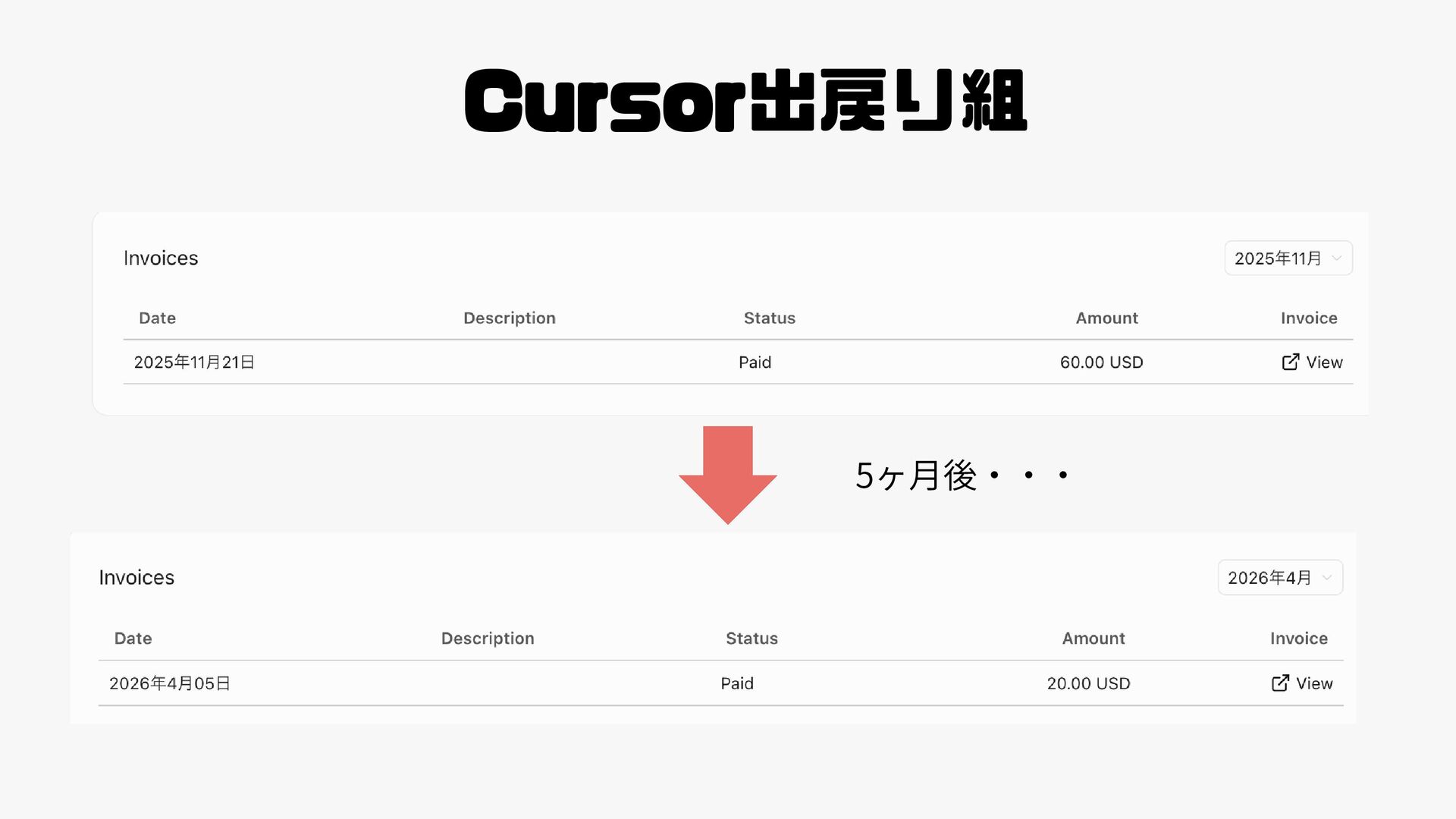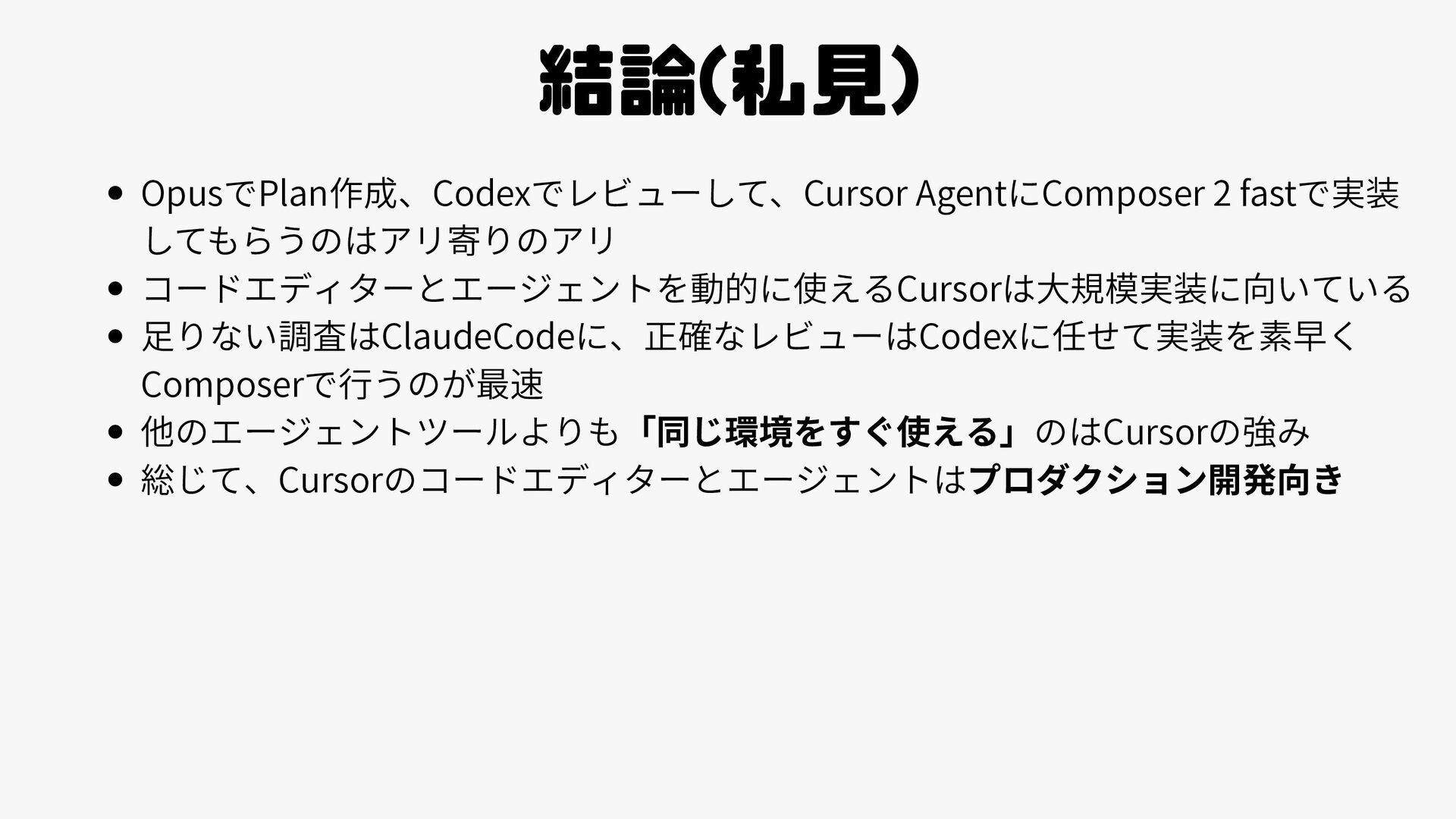 結論(私見) OpusでPlan作成、Codexでレビューして、Cursor AgentにComposer 2 fastで実装 してもらうのはアリ寄りのアリ コードエディターとエージェントを動的に使えるCursorは大規模実装に向いている 足りない調査はClaudeCodeに、正確なレビューはCodexに任せて実装を素早く Composerで行うのが最速 他のエージェントツールよりも「同じ環境をすぐ使える」のはCursorの強み